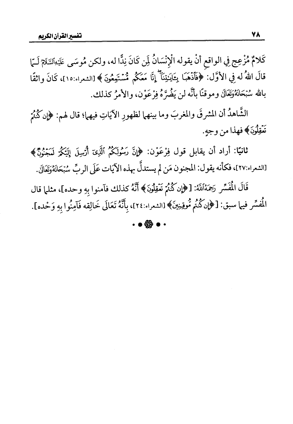 ثانيًا: أراد أن يقابل قول فِرْعَوْن: {إِنَّ رَسُولَكُمُ الَّذِي أُرْسِلَ إِلَيْكُمْ لَمَجْنُونٌ} [الشعراء: ٢٧]، فكأنه يقول: المجنون مَن لم يستدلَّ بهذه الآيَات عَلَى الربِّ سُبْحَانَهُ وَتَعَالَى.