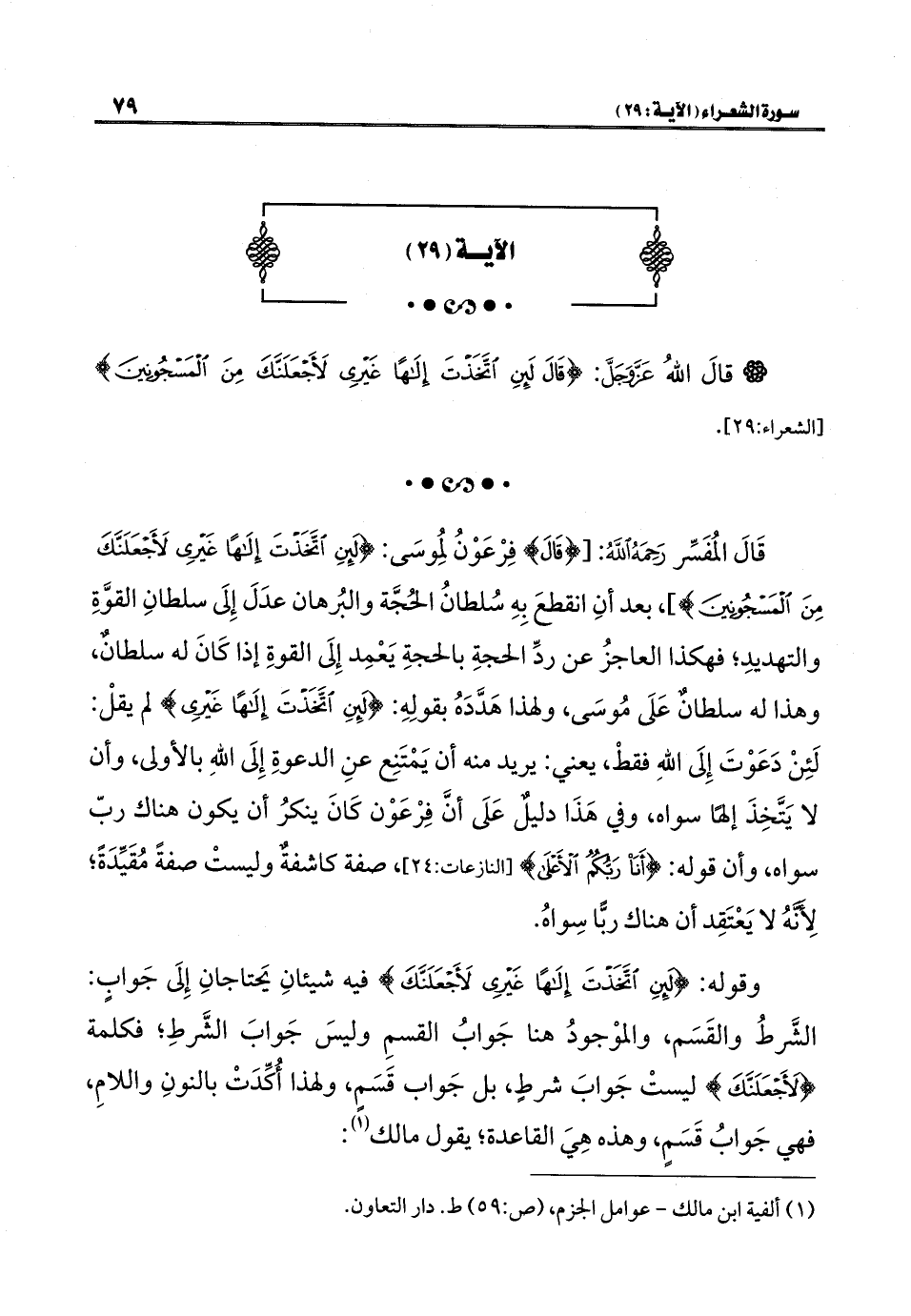 وقوله: {لَئِنِ اتَّخَذْتَ إِلَهًا غَيْرِي لَأَجْعَلَنَّكَ} فيه شيئانِ يَحتاجانِ إِلَى جَوابٍ: الشَّرطُ والقَسَم، والموْجودُ هنا جَوابُ القسمِ وليسَ جَوابَ الشَّرطِ؛ فكلمة {لَأَجْعَلَنَّكَ} ليستْ جَوابَ شرطٍ، بل جَواب قَسَمٍ، ولهذا أُكِّدَتْ بالنونِ واللامِ، فهي جَوابُ قَسَمٍ، وهذه هِيَ القاعدة؛ يقول مالك (¬١):
