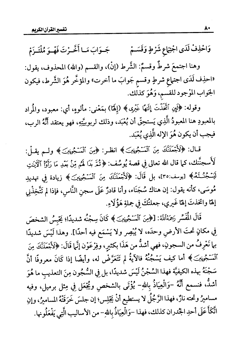 قال: {لَأَجْعَلَنَّكَ مِنَ الْمَسْجُونِينَ} انظر: {مِنَ الْمَسْجُونِينَ} ولم يقلْ: لَأَسجنَّنك، كما قال الله تعالى فِي قصة يُوسُف: {ثُمَّ بَدَا لَهُمْ مِنْ بَعْدِ مَا رَأَوُا الْآيَاتِ لَيَسْجُنُنَّهُ} [يوسف: ٣٥]، بل قَالَ: {لَأَجْعَلَنَّكَ مِنَ الْمَسْجُونِينَ} زيادة فِي تهديدِ مُوسَى، كأنه يقول: إن هناك سُجَنَاء، وأنا قادرٌ عَلَى سجنِ النَّاسِ، فإذا لم تَتَّخِذْنِي إلهًا واتخذتَ إلهًا غَيري، جعلتُكَ فِي جملةِ هَؤُلَاءِ.