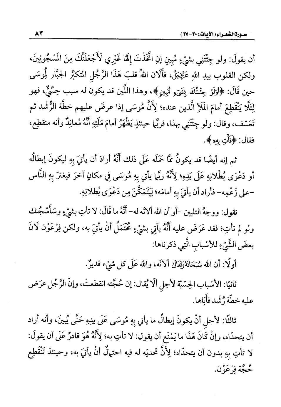 أن يقولَ: ولو جِئْتَنِي بشيْءٍ مُبِينٍ إنِ اتَّخَذْتَ إِلَهًا غَيْرِي لَأَجْعَلَنَّكَ مِنَ المَسْجُونِينَ، ولكن القلوب بيدِ اللهِ عَزَّ وَجَلَّ، فأَلان اللهُ قلبَ هَذَا الرَّجُلِ المتكبِّر الجبَّار لِمُوسَى حين قَالَ: {أَوَلَوْ جِئْتُكَ بِشَيْءٍ مُبِينٍ}، وهذا اللِّين قد يكون له سبب حِسِّيٌّ، فهو لِئَلَّا يَنْقَطِعَ أمامَ المَلَأِ الَّذين عنده؛ لِأَنَّ مُوسَى إذا عرضَ عليهم خطَّة الرُّشْد ثم تَعَسّف، وقال: ولو جِئْتَنِي بهذا، فربَّما حينئذٍ يَظْهَرُ أمامَ مَلَئِهِ أَنَّهُ مُعانِدٌ وأنه منقطِع، فقال: {فَأْتِ بِهِ}.