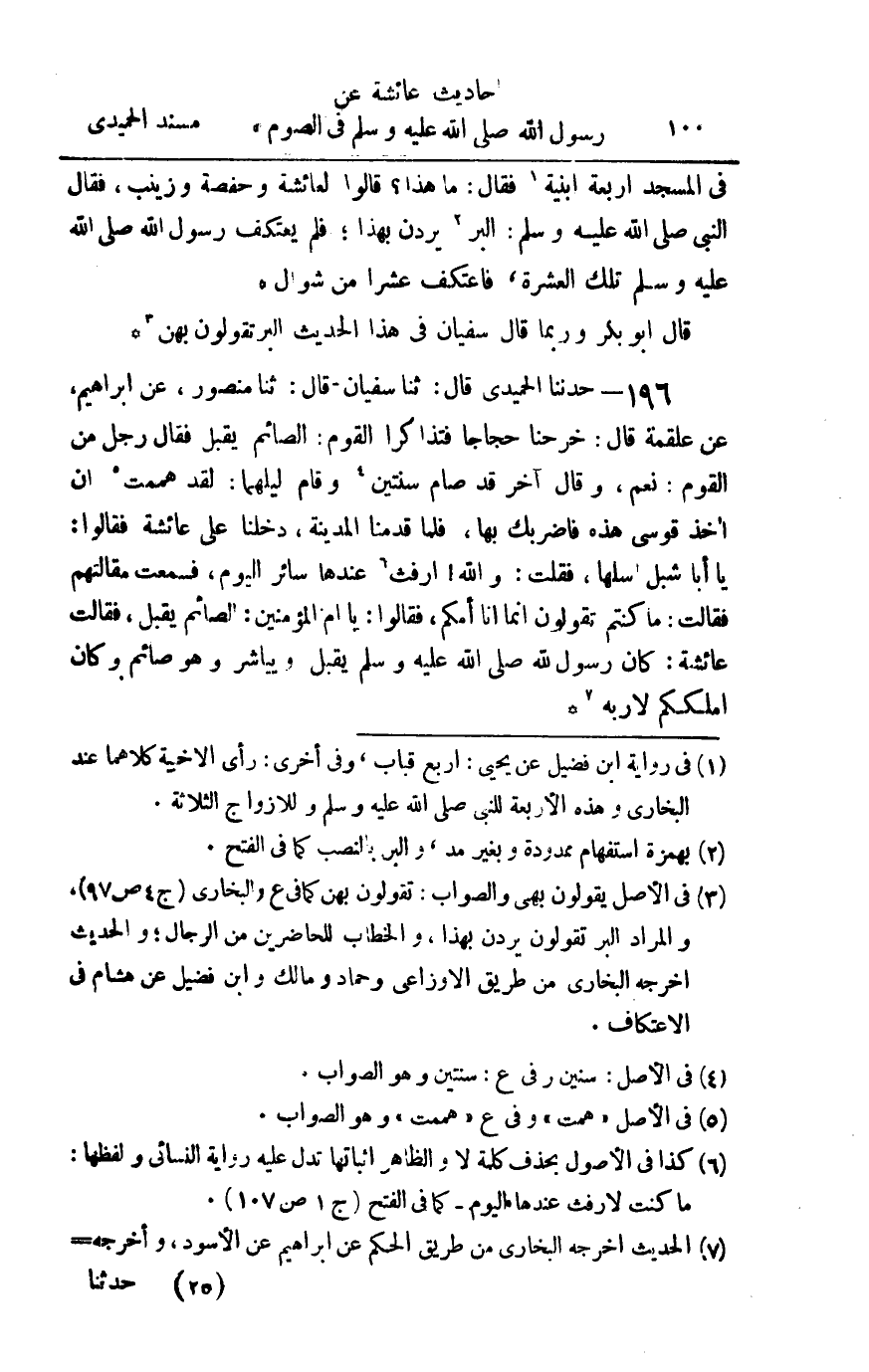 196 - حدثنا الحميدي قال ثنا سفيان قال ثنا منصور عن إبراهيم عن علقمة قال : خرجنا حجاجا فتذاكر القوم الصائم يقبل فقال رجل من القوم نعم وقال آخر قد صام سنتين وقام ليلهما لقد هممت أن آخذ قوسي هذه فأضربك بها فلما قدمنا المدينة دخلنا على عائشة فقالوا يا أبا شبل سلها فقلت والله أرفث عندها سائر اليوم فسمعت مقالتهم فقالت ما كنتم تقولون إنما أنا أمكم فقالوا يا أم المؤمنين الصائم يقبل فقالت عائشة كان رسول الله صلى الله عليه و سلم يقبل ويباشر وهو صائم وكان أملككم لأربه