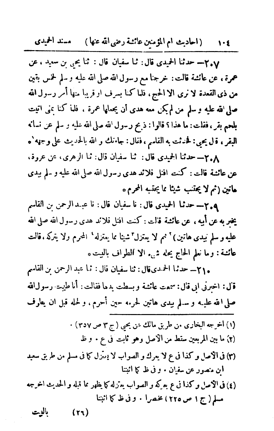 207 - حدثنا الحميدي قال ثنا سفيان قال ثنا يحيى بن سعيد عن عمرة عن عائشة قالت : خرجنا مع رسول الله صلى الله عليه و سلم لخمس بقين من ذي القعدة لا نرى إلا الحج فلما كنا بسرف أو قريبا منها أمر رسول الله صلى الله عليه و سلم من لم يكن معه هدي أن يجعلها عمرة فلما كنا بمنى أتيت بلحم بقر فقلت ما هذا قالوا ذبح رسول الله صلى الله عليه و سلم عن نسائه البقر قال يحيى فحدثت به القاسم فقال جاءتك والله بالحديث على وجهه