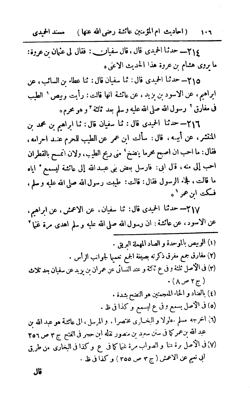 215 - حدثنا الحميدي قال ثنا سفيان قال ثنا عطاء بن السائب عن إبراهيم عن الأسود بن يزيد عن عائشة أنها قالت : رأيت وبيص الطيب في مفارق رسول الله صلى الله عليه و سلم بعد ثالثه وهو محرم