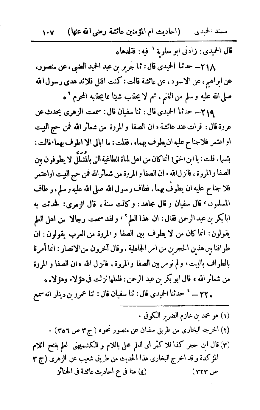 219 - حدثنا الحميدي قال ثنا سفيان قال سمعت الزهري يحدث عن عروة قال : قرأت عند عائشة إن الصفا والمروة من شعائر الله فمن حج البيت أو اعتمر فلا جناح عليه أن يطوف بهما فقلت ما أبالي إلا أطوف بهما قالت بئسما قلت يا بن أختي إنما كان من أهل لمناة الطاغية التي بالمشلل لا يطوفون بين الصفا والمروة فأنزل الله إن الصفا والمروة من شعائر الله فمن حج البيت أو اعتمر فلا جناح عليه أن يطوف بهما فطاف رسول الله صلى الله عليه و سلم وطاف المسلمون قال سفيان وقال مجاهد وكانت سنة قال الزهري فحدثت به أبا بكر بن عبد الرحمن فقال إن هذا العلم ولقد سمعت رجالا من أهل العلم يقولون إنما كان من لا يطوف بين الصفا والمروة من العرب يقولون إن طوافنا بين هذين الحجرين من أمر الجاهلية وقال آخرون من الأنصار إنما أمرنا بالطواف بالبيت ولم نؤمر بين الصفا والمروة فأنزل الله إن الصفا والمروة من شعائر الله قال أبو بكر بن عبد الرحمن فلعلها نزلت في هؤلاء وهؤلاء