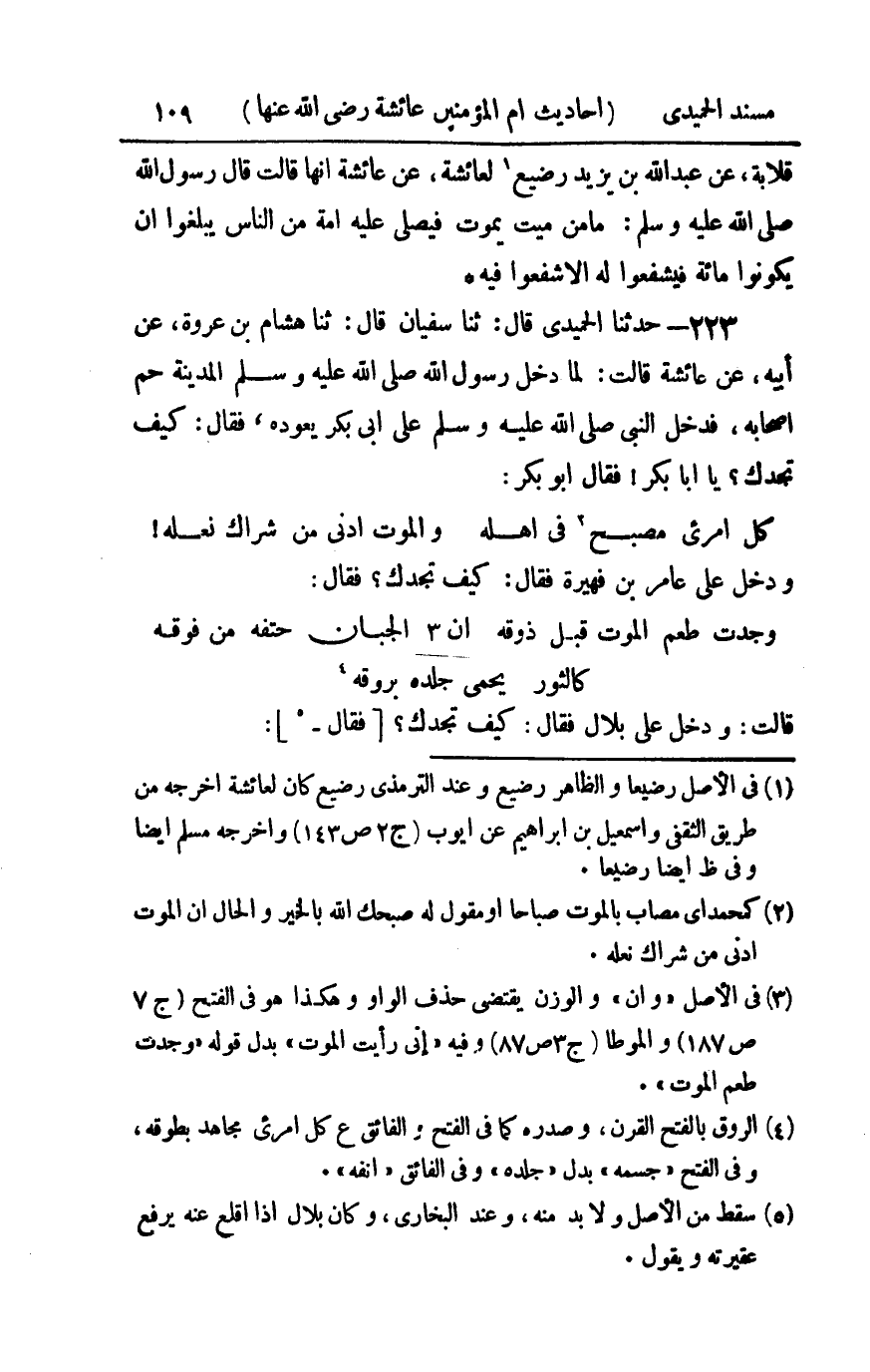 223 - حدثنا الحميدي قال ثنا سفيان قال ثنا هشام بن عروة عن أبيه عن عائشة قالت : لما دخل رسول الله صلى الله عليه و سلم المدينة حم أصحابه فدخل النبي صلى الله عليه و سلم على أبي بكر يعوده فقال كيف تجدك يا أبا بكر فقال أبو بكر ... كل امرئ مصبح في أهله ... والموت أدنى من شراك نعله ... ودخل على عامر بن فهيرة فقال كيف تجدك فقال ... وجدت طعم الموت قبل ذوقه ... إن الجبان حتفه من فوقه ... ... كالثور يحمى جلده بروقه ... قالت ودخل على بلال فقال كيف تجدك فقال [ ص 110 ] ... ... ألا ليت شعري هل أبيتن ليلة ... بفخ وربما قال سفيان بوادي وحولي أذخر وجليل ... ... وهل أردن يوما مياه مجنة ... وهل يبدون لي شامة وطفيل ... قال فقال رسول الله صلى الله عليه و سلم اللهم إن إبراهيم عبدك وخليلك دعاك لأهل مكة وأنا عبدك ورسولك أدعوك لأهل المدينة مثل ما دعاك لأهل مكة اللهم بارك لنا في صاعنا وبارك لنا في مدنا وبارك لنا في مدينتنا قال سفيان وأرى فيه وفي فرقنا اللهم حببها إلينا مثل ما حببت إلينا مكة أو أشد وصححها وانقل وباءها وحماها إلى خم أو إلى الجحفة