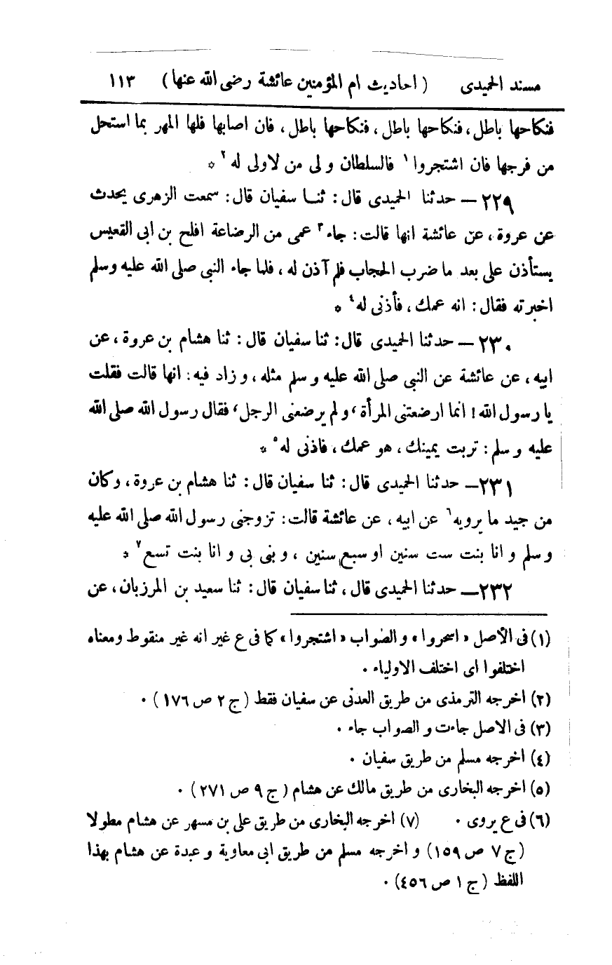 231 - حدثنا الحميدي قال ثنا سفيان قال ثنا هشام بن عروة وكان من جيد ما يرويه عن أبيه عن عائشة قالت : تزوجني رسول الله صلى الله عليه و سلم وأنا بنت ست سنين أو سبع سنين وبنى بي وأنا بنت تسع