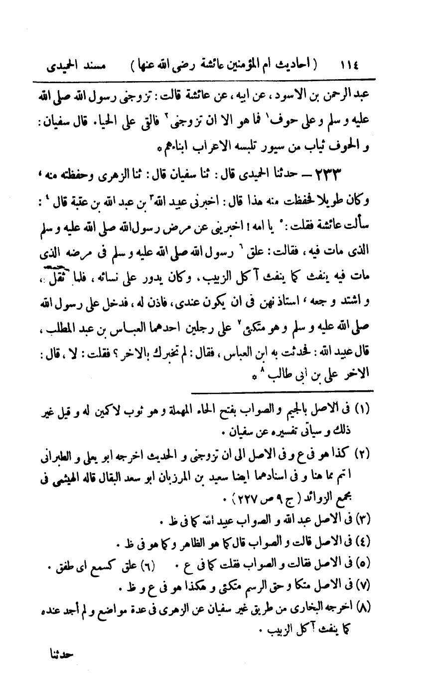 233 - حدثنا الحميدي قال ثنا سفيان قال ثنا الزهري وحفظته منه وكان طويلا فحفظت منه هذا قال أخبرني عبيد الله بن عبيد الله بن عتبة قال سألت عائشة فقلت يا أمه أخبريني عن : مرض رسول الله صلى الله عليه و سلم الذي مات فيه فقالت علق رسول الله صلى الله عليه و سلم في مرضه الذي مات فيه ينفث كما ينفث آكل الزبيب وكان يدور على نسائه فلما ثقل واشتد وجعه استأذنهن في أن يكون عندي فأذن له فدخل علي رسول الله صلى الله عليه و سلم وهو متكئ على رجلين أحدهما العباس بن عبد المطلب قال عبيد الله فحدثت به بن العباس فقال لم تخبرك بالآخر فقلت لا قال الآخر علي بن أبي طالب
