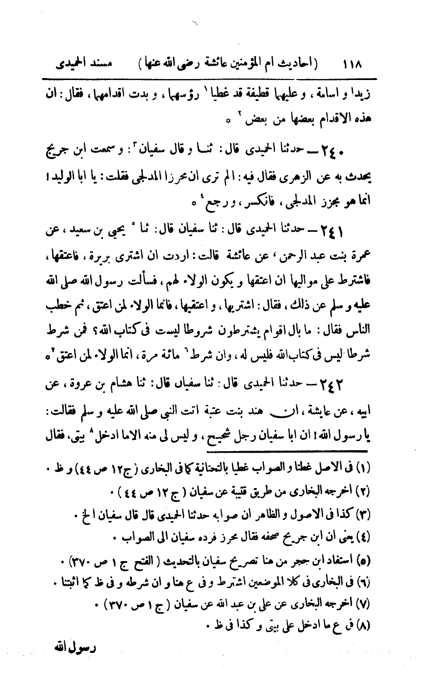242 - حدثنا الحميدي قال ثنا سفيان قال ثنا هشام بن عروة عن أبيه عن عائشة أن هند بنت عتبة أتت النبي صلى الله عليه و سلم فقالت : يا رسول الله إن أبا سفيان رجل شحيح وليس لي منه إلا ما أدخل بيتي فقال رسول الله صلى الله عليه و سلم خذي ما يكفيك وولدك بالمعروف