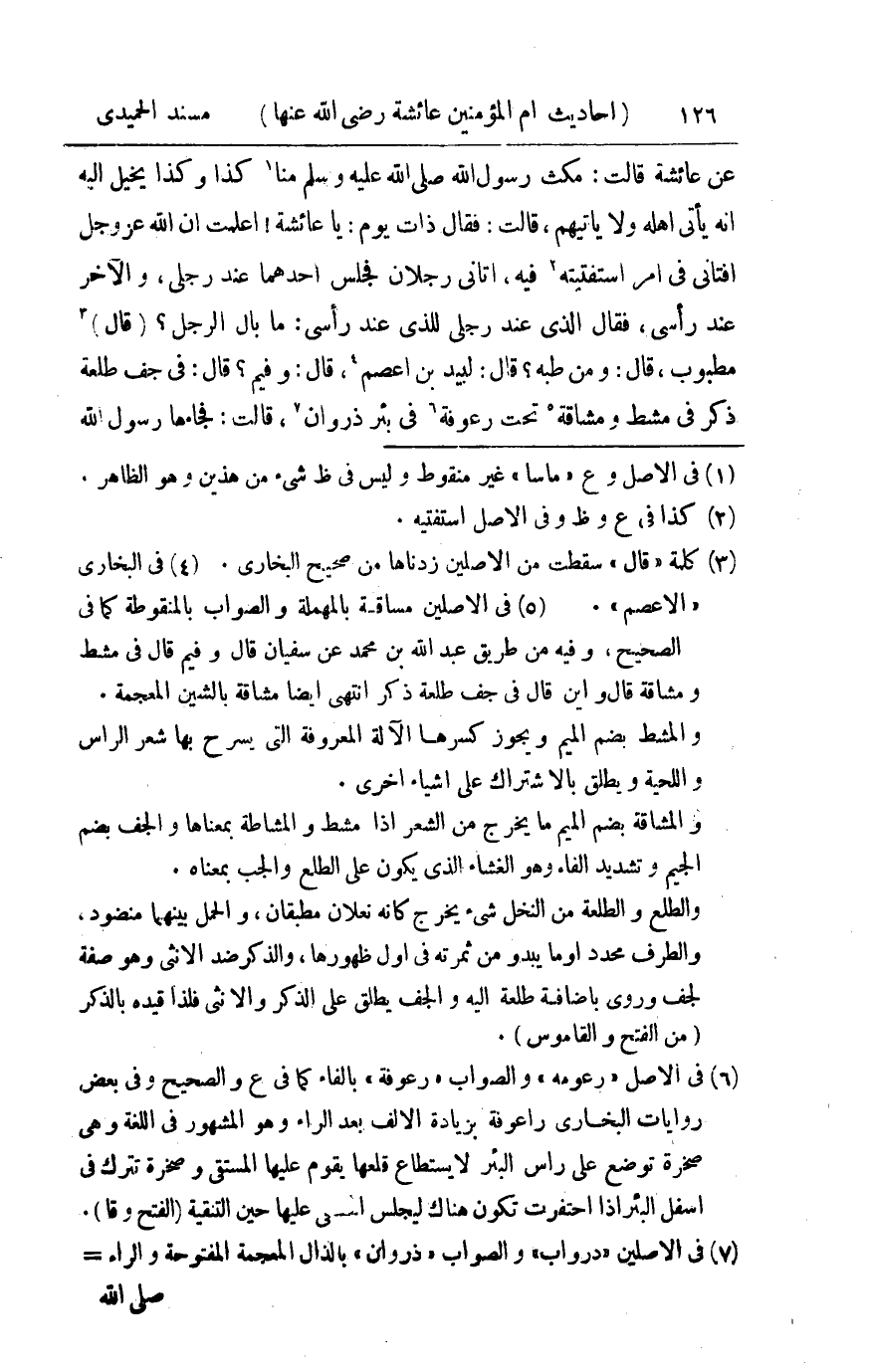 259 - حدثنا الحميدي قال ثنا سفيان قال ثنا هشام بن عروة عن أبيه عن عائشة قالت : مكث رسول الله صلى الله عليه و سلم منا كذا وكذا يخيل إليه أنه يأتي أهله ولا يأتيهم قالت فقال ذات يوم يا عائشة أعلمت أن الله عز و جل أفتاني في أمر استفتيته فيه أتاني رجلان فجلس أحدهما عند رجلي والآخر عند رأسي فقال الذي عند رجلي للذي عند رأسي ما بال الرجل قال مطبوب قال ومن طبه قال لبيد بن أعصم قال وفيم قال في جف طلعة ذكر في مشط ومشاقة تحت رعوفة في بئر ذروان قالت فجاءها رسول الله صلى الله عليه و سلم فقال هذه البئر التي أريتها كأن رؤوس نخلها رؤوس الشياطين وكأن ماءها نقاعة الحناء قالت فأمر به رسول الله صلى الله عليه و سلم فأخرج قالت عائشة فقلت يا رسول الله فهلا قال سفيان يعني تنشرت فقال أما والله فقد شفاني وأما أنا فأكره أن أثير على الناس منه شرا قالت ولبيد بن أعصم رجل من بني زريق حليف ليهود قال سفيان وكان عبد الملك بن جريج حدثناه أولا قبل أن نلقى هشاما فقال حدثني بعض آل عروة فلما قدم هشام حدثناه