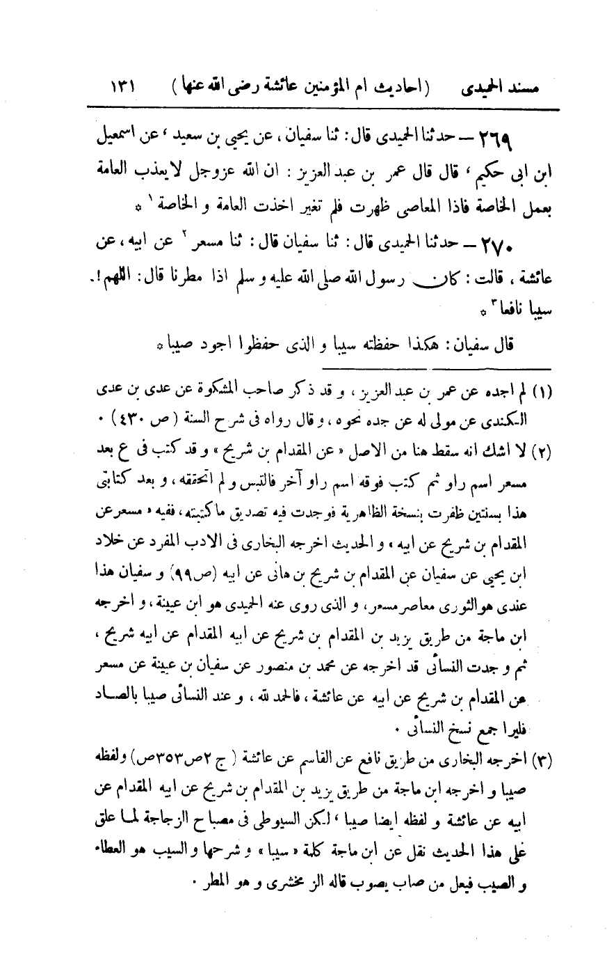 270 - حدثنا الحميدي قال ثنا سفيان قال ثنا مسعر عن أبيه عن عائشة قالت : كان رسول الله صلى الله عليه و سلم إذا مطرنا قال اللهم سيبا نافعا قال سفيان هكذا حفظته سيبا والذي حفظوا أجود صيبا