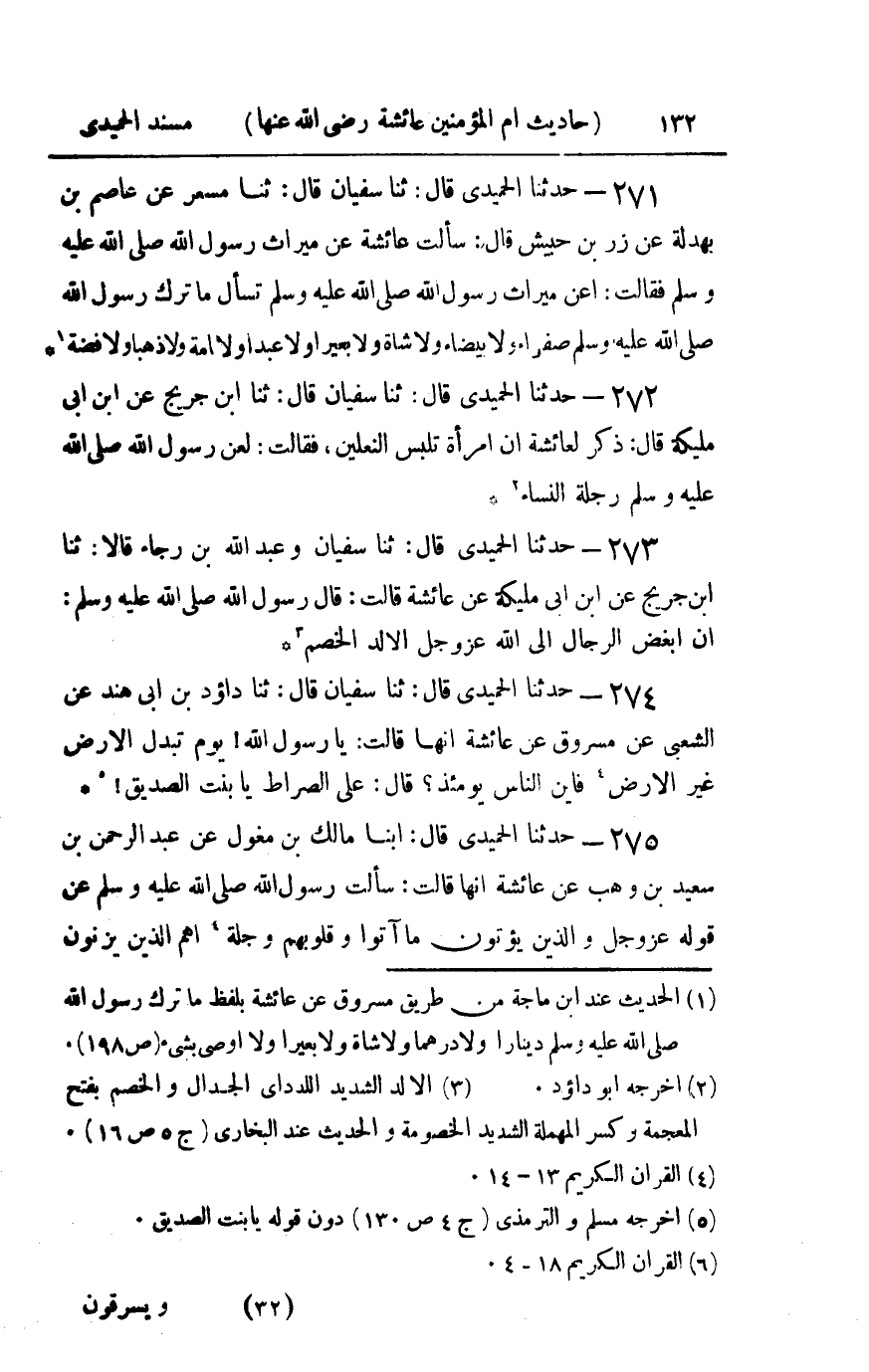 271 - حدثنا الحميدي قال ثنا سفيان قال ثنا مسعر عن عاصم بن بهدلة عن زر بن حبيش قال سألت عائشة عن ميراث رسول الله صلى الله عليه و سلم فقالت : أعن ميراث رسول الله صلى الله عليه و سلم تسأل ما ترك رسول الله صلى الله عليه و سلم صفراء ولا بيضاء ولا شاة ولا بعيرا ولا عبدا ولا أمة ولا ذهبا ولا فضة