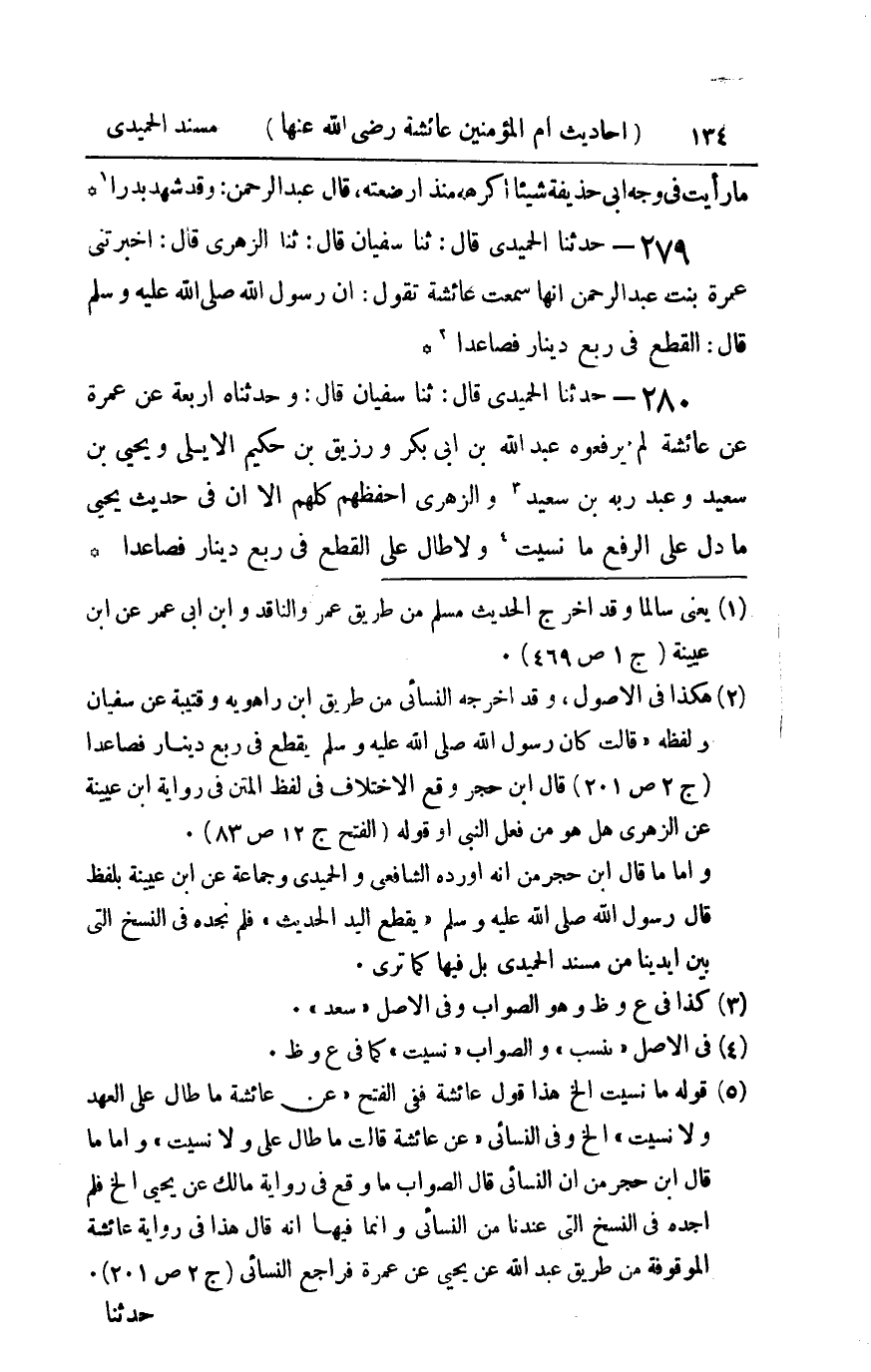280 - حدثنا الحميدي قال ثنا سفيان قال وحدثناه أربعة عن عمرة عن عائشة : لم يرفعوه عبد الله بن أبي بكر ورزيق بن حكيم الأيلي ويحيى بن سعيد وعبد ربه بن سعيد والزهري أحفظهم كلهم إلا أن في حديث يحيى ما دل على الرفع ما نسيت ولا طال على القطع في ربع دينار فصاعدا
