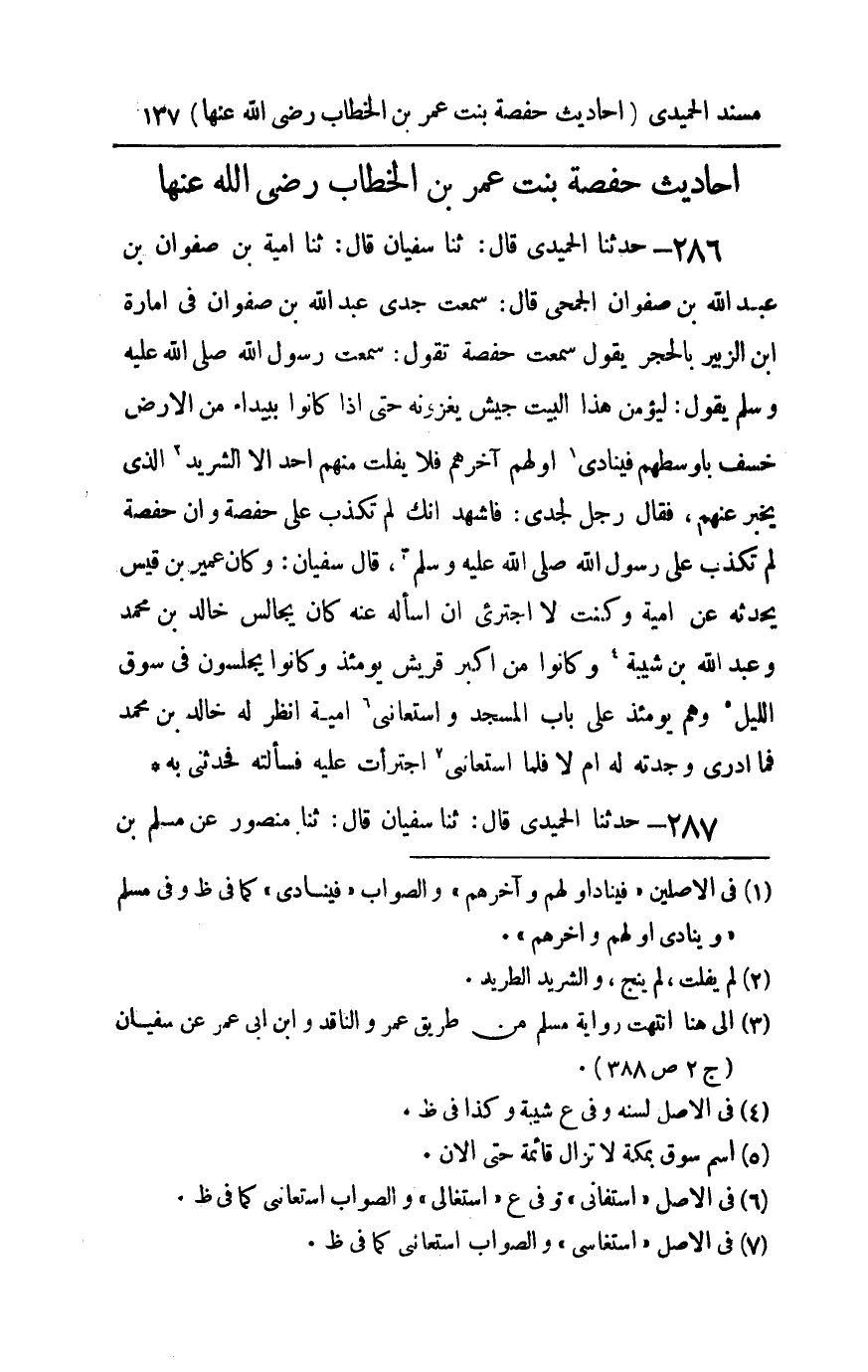 286 - حدثنا الحميدي قال ثنا سفيان قال ثنا أمية بن صفوان بن عبد الله بن صفوان الجمحي قال سمعت جدي عبد الله بن صفوان في إمارة بن الزبير بالحجر يقول سمعت حفصة تقول سمعت رسول الله صلى الله عليه و سلم يقول : ليؤمن هذا البيت جيش يغزونه حتى إذا كانوا ببيداء من الأرض خسف بأوسطهم فينادي أولهم آخرهم فلا يفلت منهم أحد إلا الشريد الذي يخبر عنهم فقال رجل لجدي فاشهد أنك لم تكذب على حفصة وأن حفصة لم تكذب على رسول الله صلى الله عليه و سلم قال سفيان وكان عمير بن قيس يحدثه عن أمية وكنت لا أجتريء أن أسأله عنه كان يجالس خالد بن محمد وعبد الله بن شيبة وكانوا من أكبر قريش يومئذ وكانوا يجلسون في سوق الليل وهم يومئذ على باب المسجد واستعانني أمية أنظر له خالد بن محمد فما أدري وجدته له أم لا فلما استعانني اجترأت عليه فسألته فحدثني به