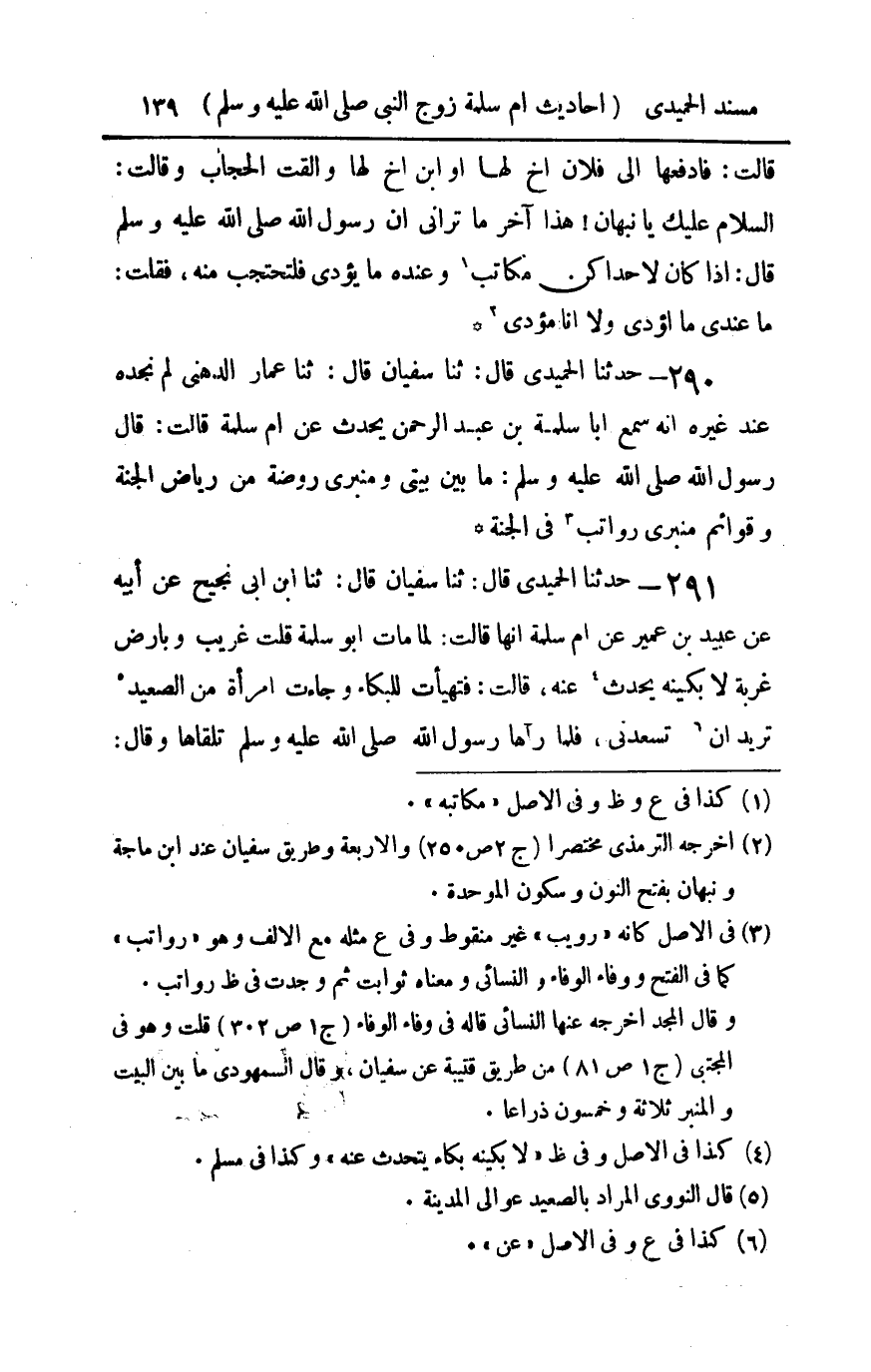 290 - حدثنا الحميدي قال ثنا سفيان قال ثنا عمار الدهني لم نجده عند غيره أنه سمع أبا سلمة بن عبد الرحمن يحدث عن أم سلمة قالت قال رسول الله صلى الله عليه و سلم : ما بين بيتي ومنبري روضة من رياض الجنة وقوائم منبري رواتب في الجنة