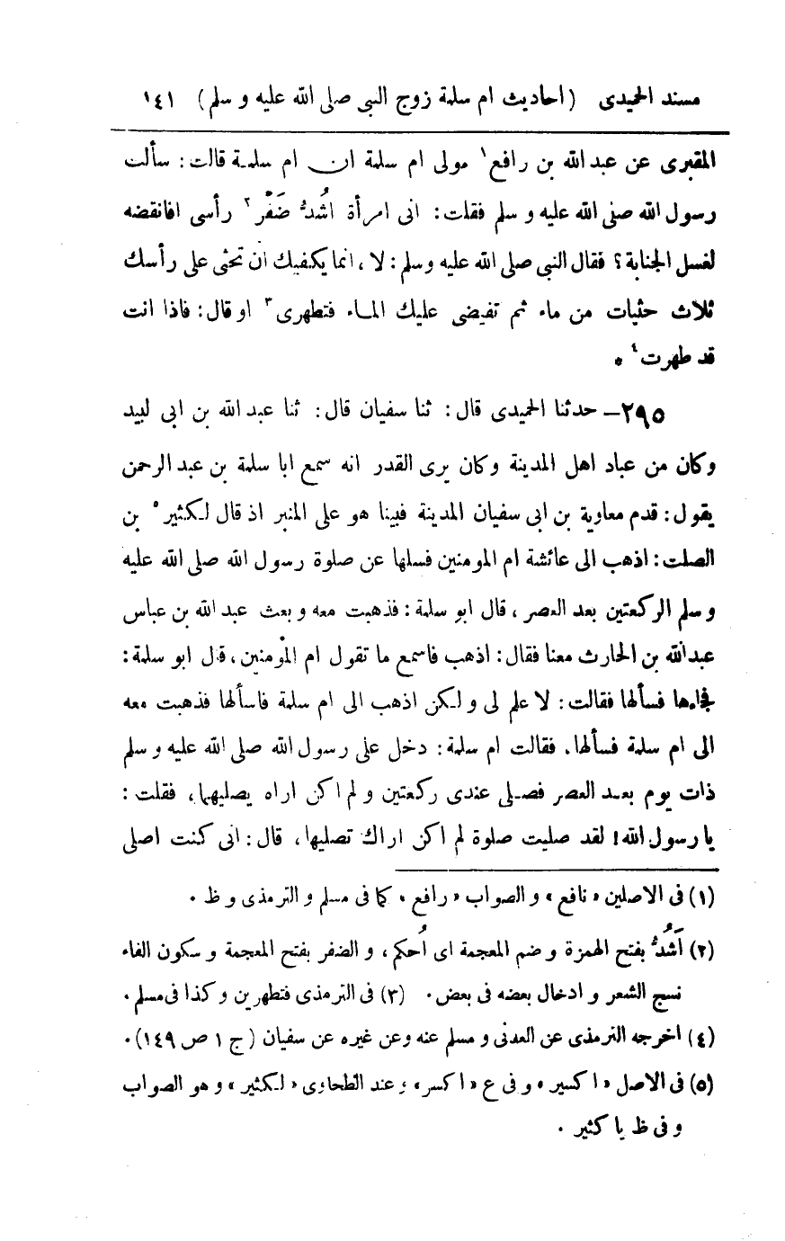 295 - حدثنا الحميدي قال ثنا سفيان قال ثنا عبد الله بن أبي لبيد وكان من عباد أهل المدينة وكان يرى القدر أنه سمع أبا سلمة بن عبد الرحمن يقول : قدم معاوية بن أبي سفيان المدينة فبينا هو على المنبر إذ قال لكثير بن الصلت اذهب إلى عائشة أم المؤمنين فسلها عن صلاة رسول الله صلى الله عليه و سلم الركعتين بعد العصر قال أبو سلمة فذهبت معه وبعث عبد الله بن عباس عبد الله بن الحارث معنا فقال اذهب فاسمع ما تقول أم المؤمنين قال أبو سلمة فجاءها فسألها فقالت لا علم لي ولكن اذهب إلى أم سلمة فاسألها فذهبت معه إلى أم سلمة فسألها فقالت أم سلمة دخل علي رسول الله صلى الله عليه و سلم ذات يوم بعد العصر فصلى عندي ركعتين ولم أكن أراه يصليهما فقلت يا رسول الله لقد صليت صلاة لم أكن أراك تصليها قال إني كنت أصلي ركعتين بعد الظهر وأنه قدم على وفد بني تميم أو صدقة فشغلوني عنهما فهما هاتان الركعتان