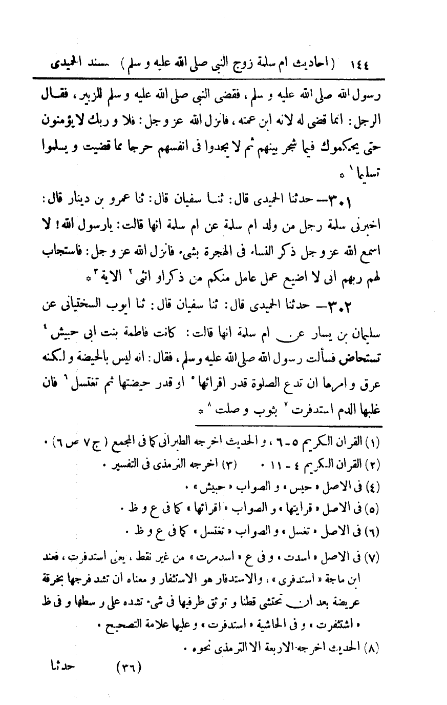 302 - حدثنا الحميدي قال ثنا سفيان قال ثنا أيوب السختياني عن سليمان بن يسار عن أم سلمة أنها قالت كانت فاطمة بنت أبي حبيش تستحاض فسألت رسول الله صلى الله عليه و سلم فقال : أنه ليس بالحيضة ولكنه عرق وأمرها أن تدع الصلاة قدر إقرائها أو قدر حيضتها ثم تغتسل فإن غلبها الدم استدفرت بثوب وصلت