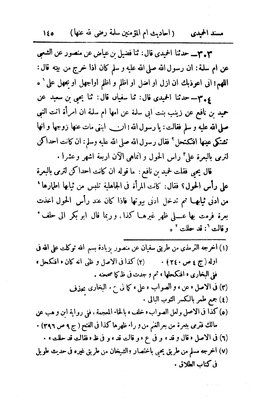 304 - حدثنا الحميدي قال ثنا سفيان قال ثنا يحيى بن سعيد عن حميد بن نافع عن زينب بنت أبي سلمة عن أمها أم سلمة أن امرأة أتت النبي صلى الله عليه و سلم فقالت : يا رسول الله إن ابنتي مات عنها زوجها وإنها تشتكي عينها أفتكتحل فقال رسول الله صلى الله عليه و سلم إن كانت إحداكن لترمى بالبعرة على رأس الحول وإنما هي الآن أربعة أشهر وعشرا قال يحيى فقلت لحميد بن نافع ما قوله إن كانت إحداكن لترمي بالبعرة على رأس الحول فقال كانت المرأة في الجاهلية تلبس من ثيابها أطمارها من أدنى ثيابها ثم تدخل أدنى بيوتها فإذا كان عند رأس الحول أخذت بعرة فرمت بها على ظهر غيرها كذا وربما قال أبو بكر إلى حلف وقالت قد حللت