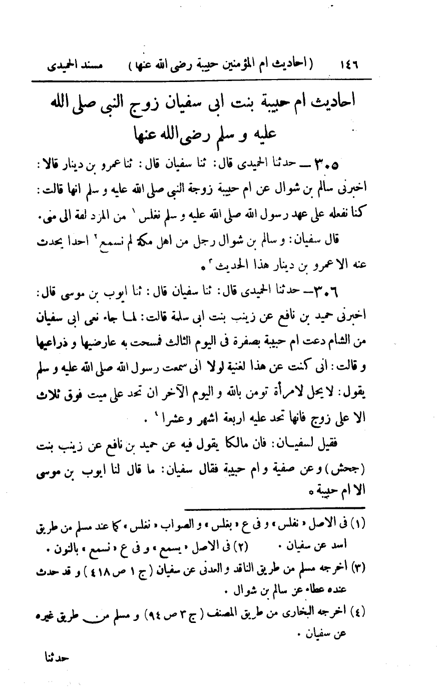 306 - حدثنا الحميدي قال ثنا سفيان قال ثنا أيوب بن موسى قال أخبرني حميد بن نافع عن زينب بنت أبي سلمة قالت : لما جاء نعي أبي سفيان من الشام دعت أم حبيبة بصفرة في اليوم الثالث فمسحت به عارضيها وذراعيها وقالت إني كنت عن هذا لغنية لولا أني سمعت رسول الله صلى الله عليه و سلم يقول لا يحل لامرأة تؤمن بالله واليوم الآخر أن تحد على ميت فوق ثلاث إلا على زوج فإنها تحد عليه أربعة أشهر وعشرا فقيل لسفيان فإن مالكا يقول فيه عن حميد بن نافع عن زينب بنت جحش وعن صفية وأم حبيبة فقال سفيان ما قال لنا أيوب بن موسى إلا أم حبيبة
