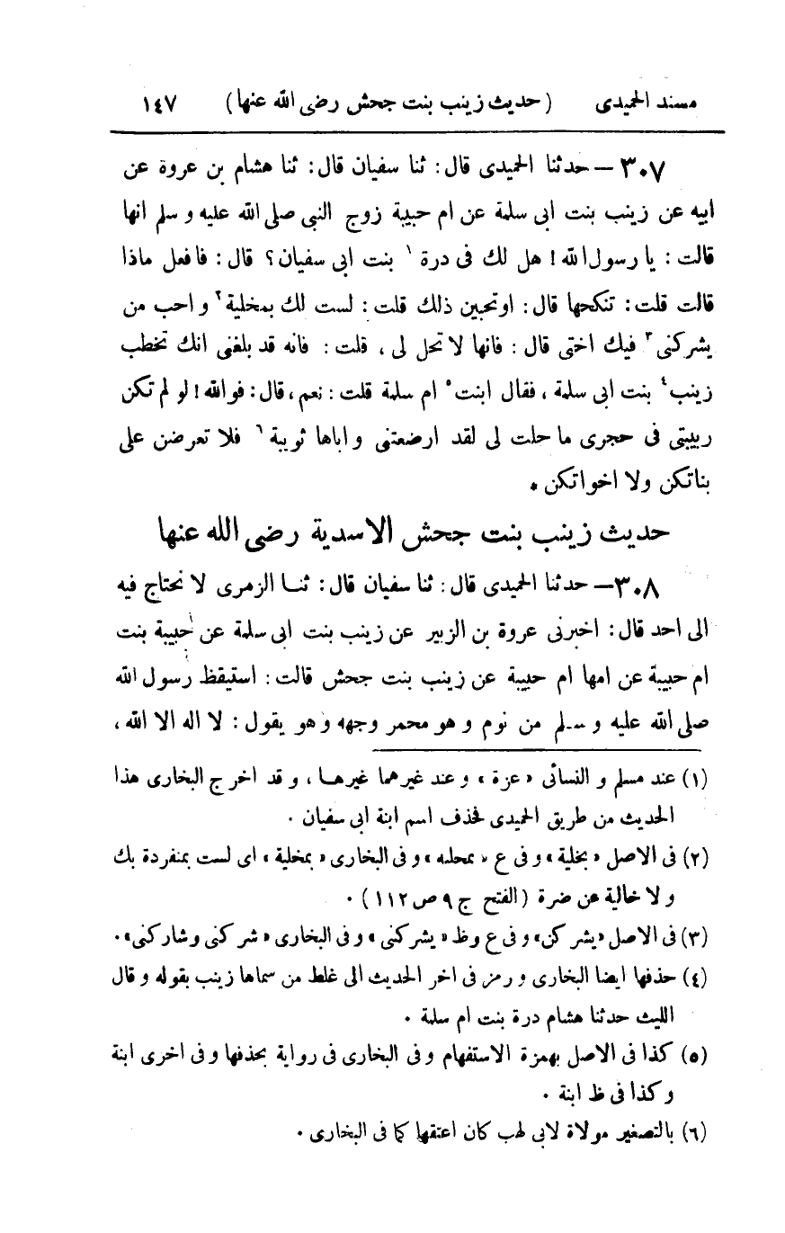 307 - حدثنا الحميدي قال ثنا سفيان قال ثنا هشام بن عروة عن أبيه عن زينب بنت أبي سلمة عن أم حبيبة زوج النبي صلى الله عليه و سلم أنها قالت : يا رسول الله هل لك في درة بنت أبي سفيان قال فافعل ماذا قالت قلت تنكحها قال أو تحبين ذلك قلت لست لك بمخلية وأحب من يشركني فيك أختي قال فإنها لا تحل لي قلت فإنه قد بلغني أنك تخطب زينب بنت أبي سلمة فقال ابنة أم سلمة قلت نعم قال فوالله لو لم تكن ربيبتي في حجري ما حلت لي لقد أرضعتني وأباها ثويبة فلا تعرضن علي بناتكن ولا أخواتكن