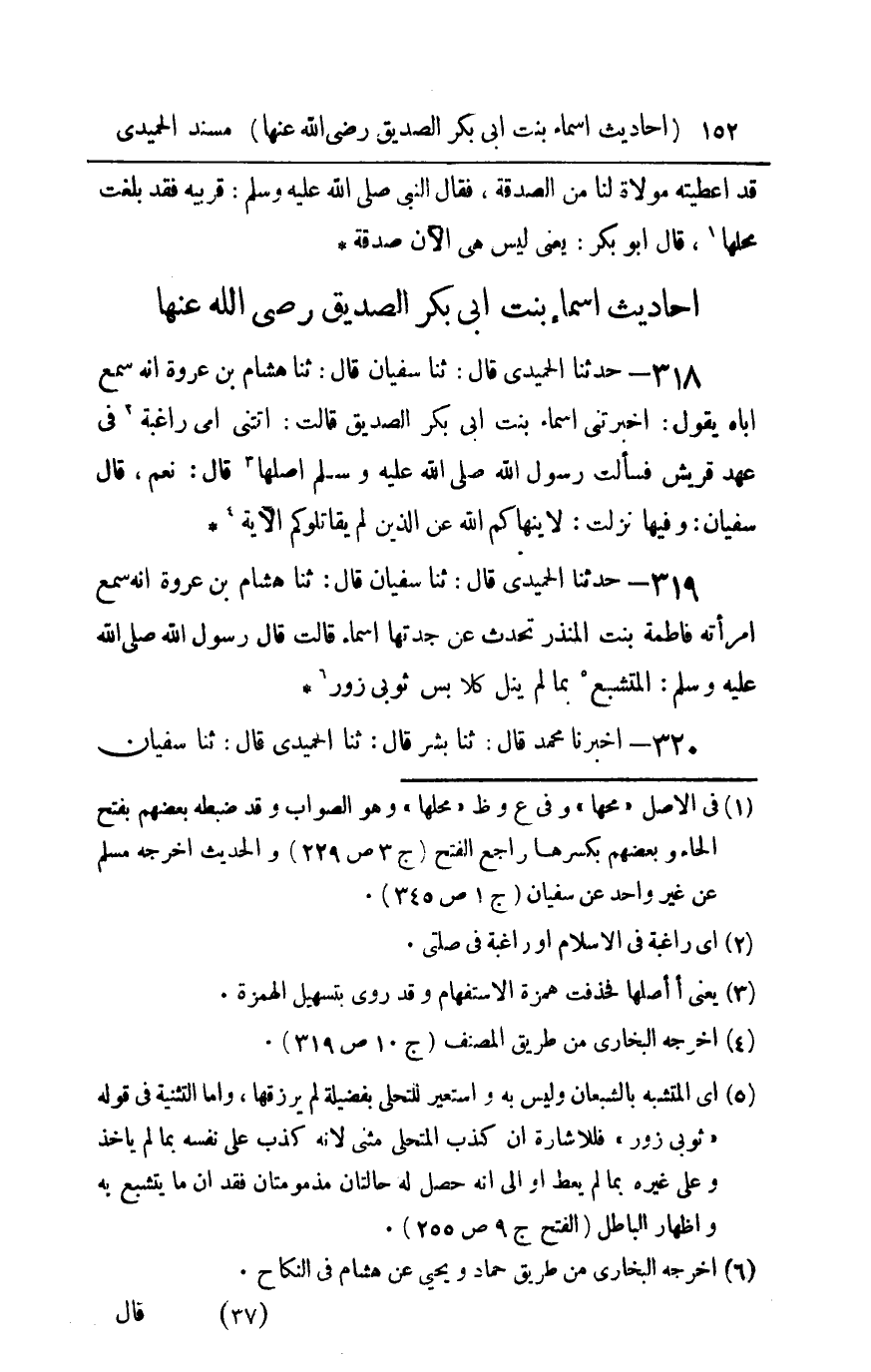 318 - حدثنا الحميدي قال ثنا سفيان قال ثنا هشام بن عروة أنه سمع أباه يقول أخبرتني أسماء بنت أبي بكر الصديق قالت : أتتني أمي راغبة في عهد قريش فسألت رسول الله صلى الله عليه و سلم أصلها قال نعم قال سفيان وفيها نزلت لا ينهاكم الله عن الذين لم يقاتلوكم الآية