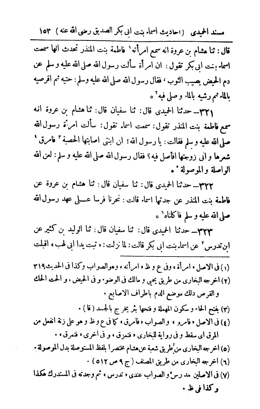 321 - حدثنا الحميدي قال ثنا سفيان قال ثنا هشام بن عروة أنه سمع فاطمة بنت المنذر تقول سمعت أسماء تقول سألت امرأة رسول الله صلى الله عليه و سلم فقالت : يا رسول الله إن ابنتي أصابتها الحصبة فامرق شعرها وإني زوجتها أفأصل فيه فقال رسول الله صلى الله عليه و سلم لعن الله الواصلة والموصولة