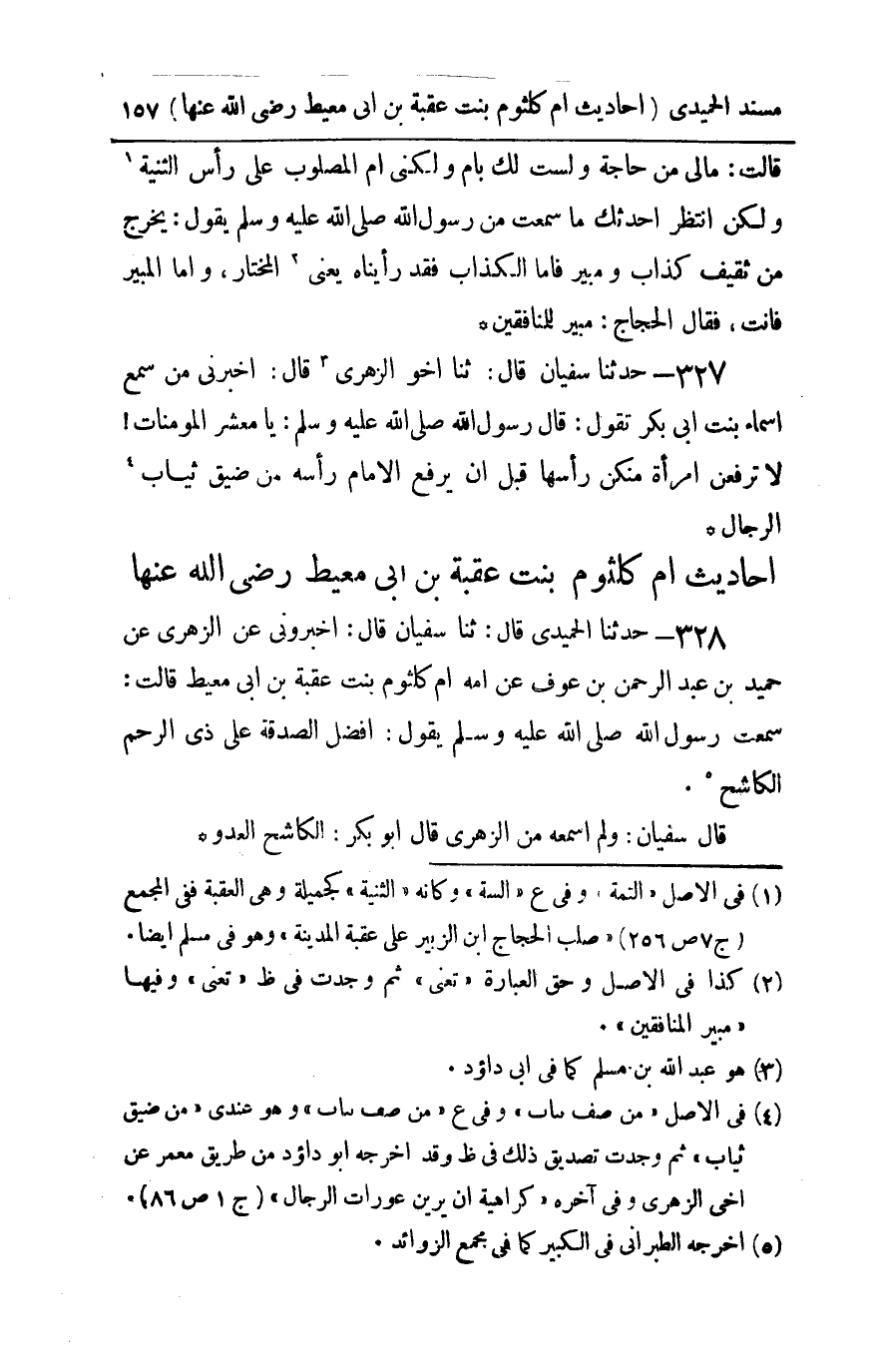 328 - حدثنا الحميدي قال ثنا سفيان قال أخبروني عن الزهري عن حميد بن عبد الرحمن بن عوف عن أمه أم كلثوم بنت عقبة بن أبي معيط قالت سمعت رسول الله صلى الله عليه و سلم يقول : أفضل الصدقة على ذي الرحم الكاشح قال سفيان ولم أسمعه من الزهري قال أبو بكر الكاشح العدو