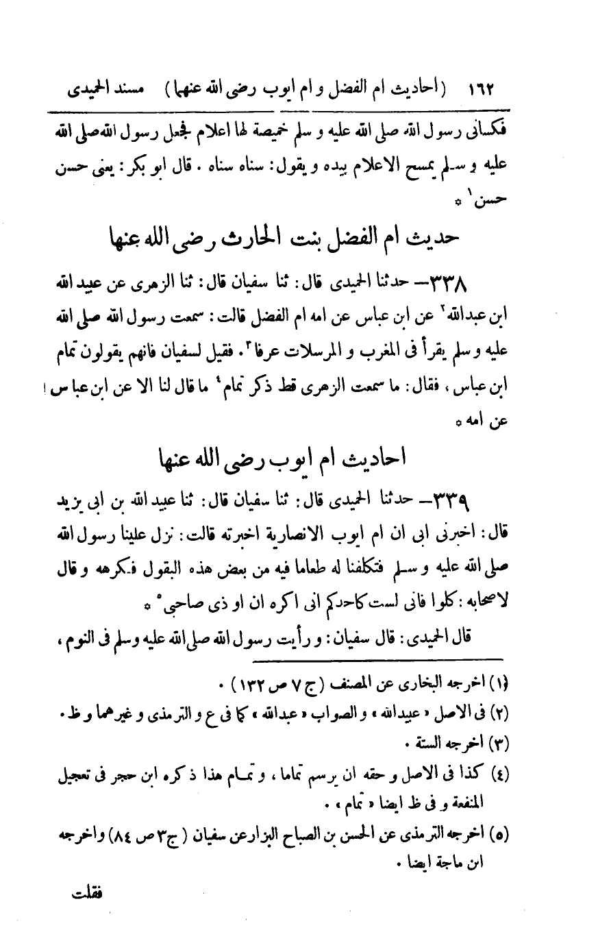 339 - حدثنا الحميدي قال ثنا سفيان قال ثنا عبيد الله بن أبي يزيد قال أخبرني أبي أن أم أيوب الأنصارية أخبرته قالت : نزل علينا رسول الله صلى الله عليه و سلم فتكلفنا له طعاما فيه من بعض هذه البقول فكرهه وقال لأصحابه كلوا فإني لست كأحدكم إني أكره أن أوذي صاحبي قال الحميدي قال سفيان ورأيت رسول الله صلى الله عليه و سلم في النوم فقلت يا رسول الله أرأيت هذا الذي يحدث به عنك أن الملائكة تتأذى مما يتأذى منه بنو آدم فقال حق