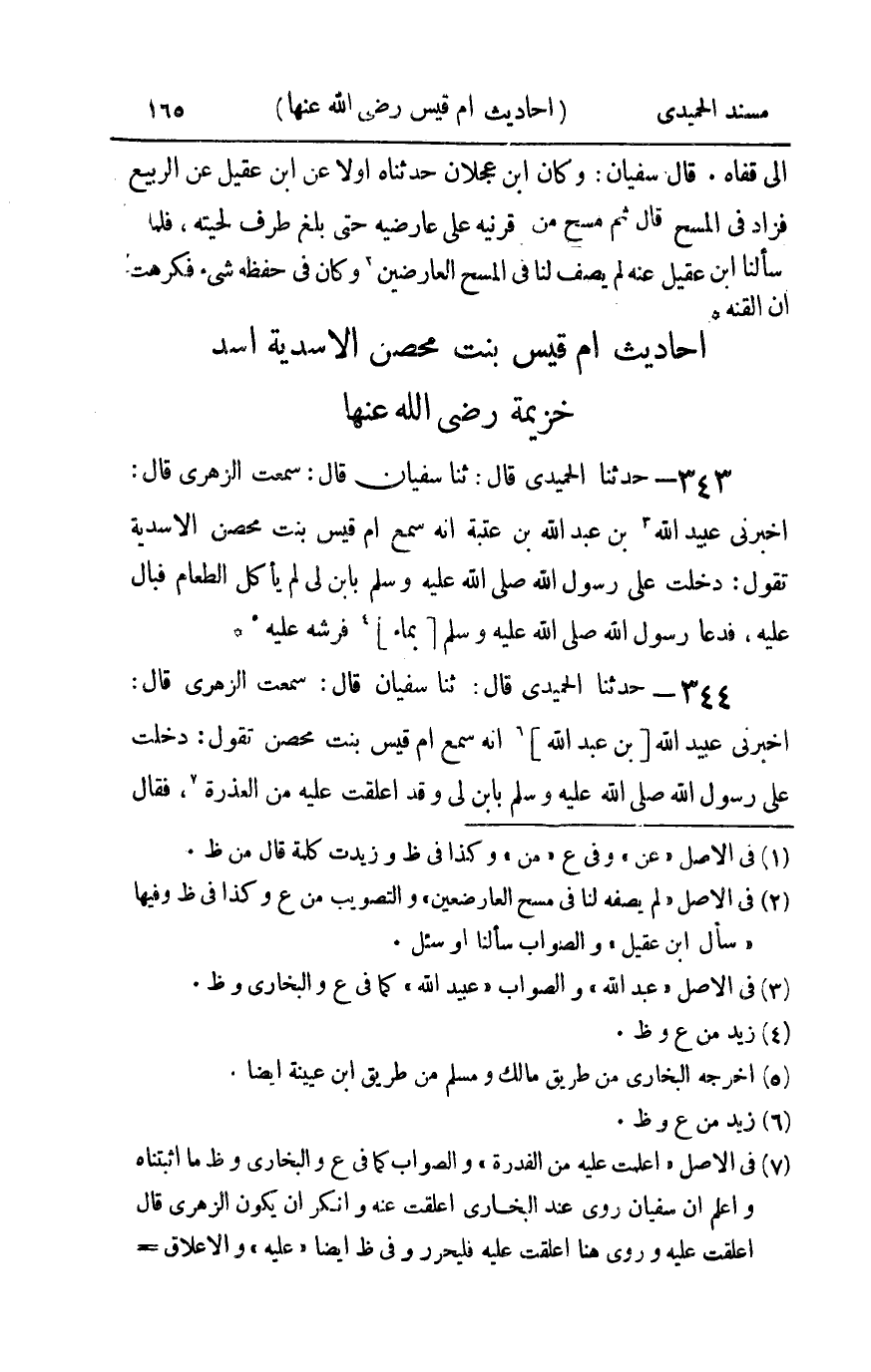 343 - حدثنا الحميدي قال ثنا سفيان قال سمعت الزهري قال أخبرني عبيد الله بن عبد الله بن عتبة أنه سمع أم قيس بنت محصن الأسدية تقول : دخلت على رسول الله صلى الله عليه و سلم بابن لي لم يأكل الطعام فبال عليه فدعا رسول الله صلى الله عليه و سلم بماء فرشه عليه