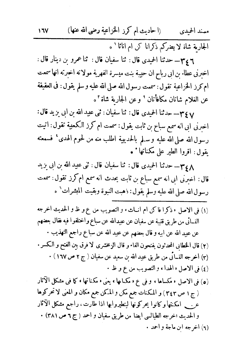 347 - حدثنا الحميدي قال ثنا سفيان قال ثنا عبيد الله بن أبي يزيد قال أخبرني أبي أنه سمع سباع بن ثابت يقول سمعت أم كرز الكعبية تقول : أتيت رسول الله صلى الله عليه و سلم بالحديبية أطلب منه من لحوم الهدى فسمعته يقول أقروا الطير على مكناتها