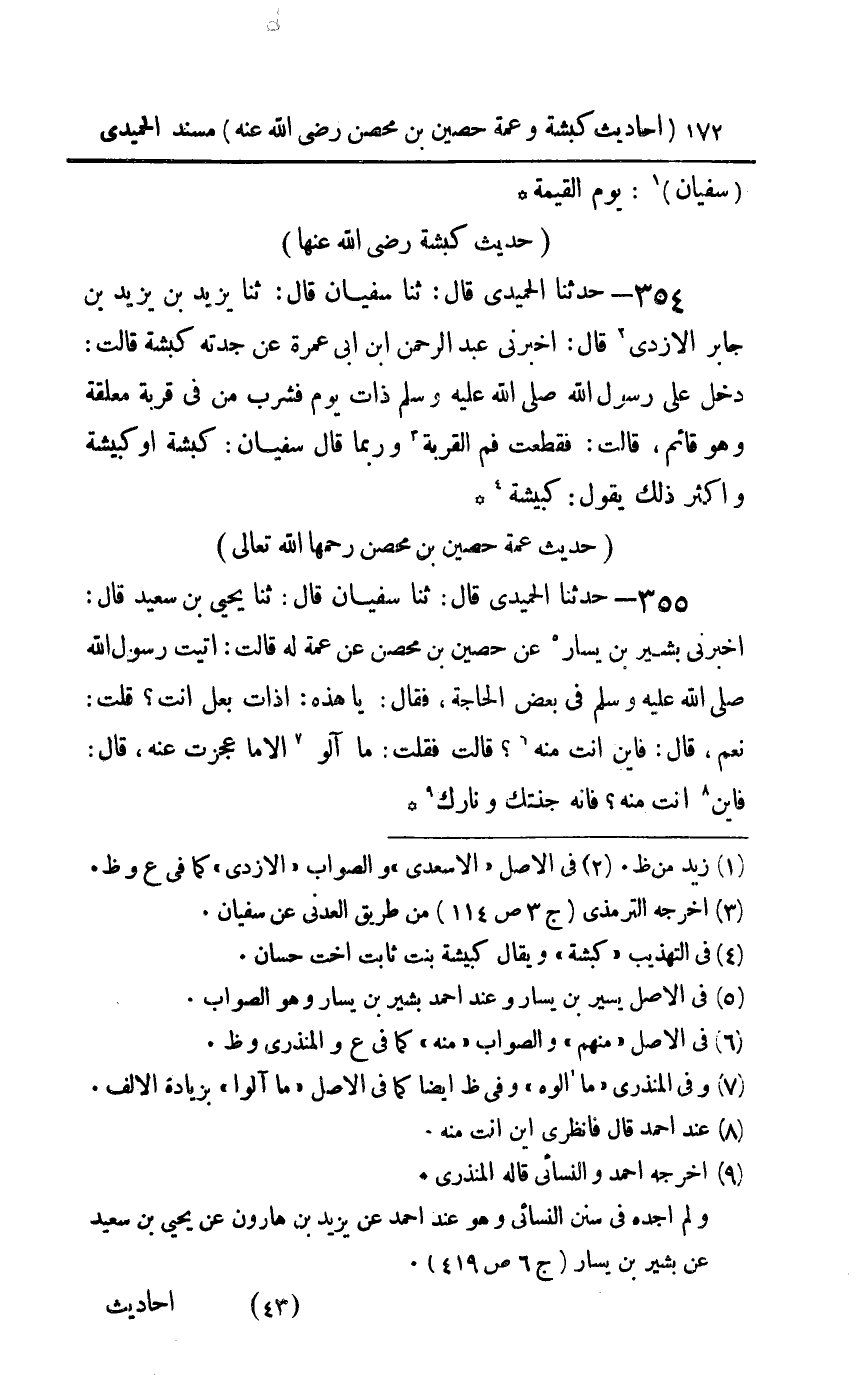 354 - حدثنا الحميدي قال ثنا سفيان قال ثنا يزيد بن يزيد بن جابر الأزدي قال أخبرني عبد الرحمن بن أبي عمرة عن جدته كبشة قالت : دخل علي رسول الله صلى الله عليه و سلم ذات يوم فشرب من في قربة معلقة وهو قائم قالت فقطعت فم القربة وربما قال سفيان كبشة أو كبيشة وأكثر ذلك يقول كبيشة
