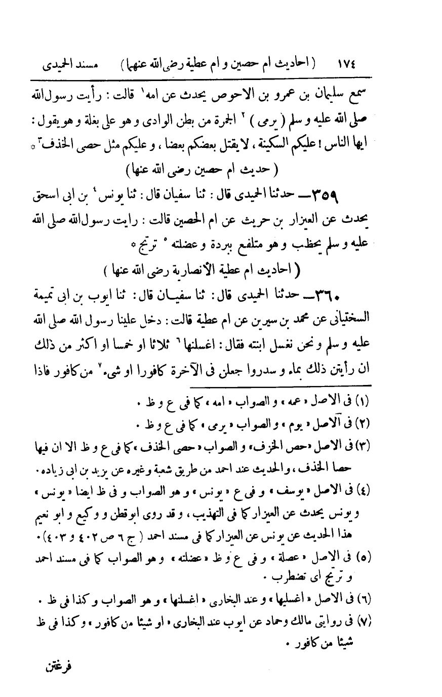 360 - حدثنا الحميدي قال ثنا سفيان قال ثنا أيوب بن أبي تميمة السختياني عن محمد بن سيرين عن أم عطية قالت : دخل علينا رسول الله صلى الله عليه و سلم ونحن نغسل ابنته فقال اغسلنها ثلاثا أو خمسا أو أكثر من ذلك إن رأيتن ذلك بماء وسدر واجعلن في الآخرة كافورا أو شيء من كافور فإذا فرغتن فآذنني فلما فرغنا آذناه فألقى إلينا حقوة فقال أشعرنها إياه قال سفيان وحدثناه أيوب عن حفصة بنت سيرين عن أم عطية عن النبي صلى الله عليه و سلم بمثله وزاد فيه قالت وجعلنا رأسها ثلاثة قرون