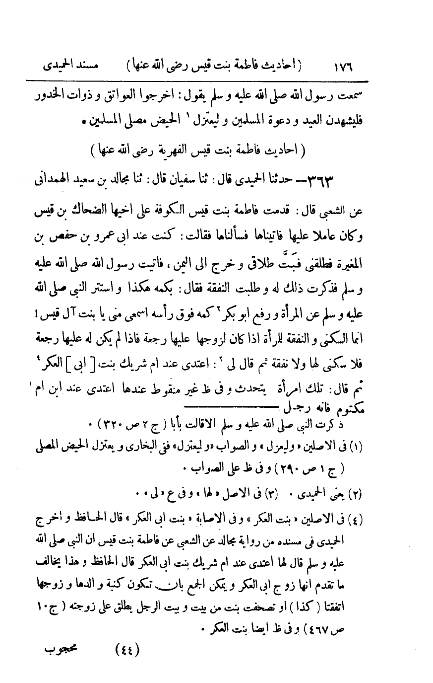 363 - حدثنا الحميدي قال ثنا سفيان قال ثنا مجالد بن سعيد الهمداني عن الشعبي قال : قدمت فاطمة بنت قيس الكوفة على أخيها الضحاك بن قيس وكان عاملا عليها فأتيناها فسألناها فقالت كنت عند أبي عمرو بن حفص بن المغيرة فطلقني فبت طلاقي وخرج إلى اليمن فأتيت رسول الله صلى الله عليه و سلم فذكرت ذلك له وطلبت النفقة فقال بكمه هكذا واستتر النبي صلى الله عليه و سلم عن المرأة ورفع أبو بكر كمه فوق رأسه اسمعي مني يا بنت آل قيس إنما السكنى والنفقة للمرأة إذا كان لزوجها عليها رجعة فإذا لم يكن له عليها رجعة فلا سكنى لها ولا نفقة ثم قال لي إعتدي عند أم شريك بنت أبي العكر ثم قال تلك امرأة يتحدث وفي ظ غير منقوط عندها اعتدي عند بن أم مكتوم فإنه رجل محجوب البصر فتضعين ثيابك فلا يراك