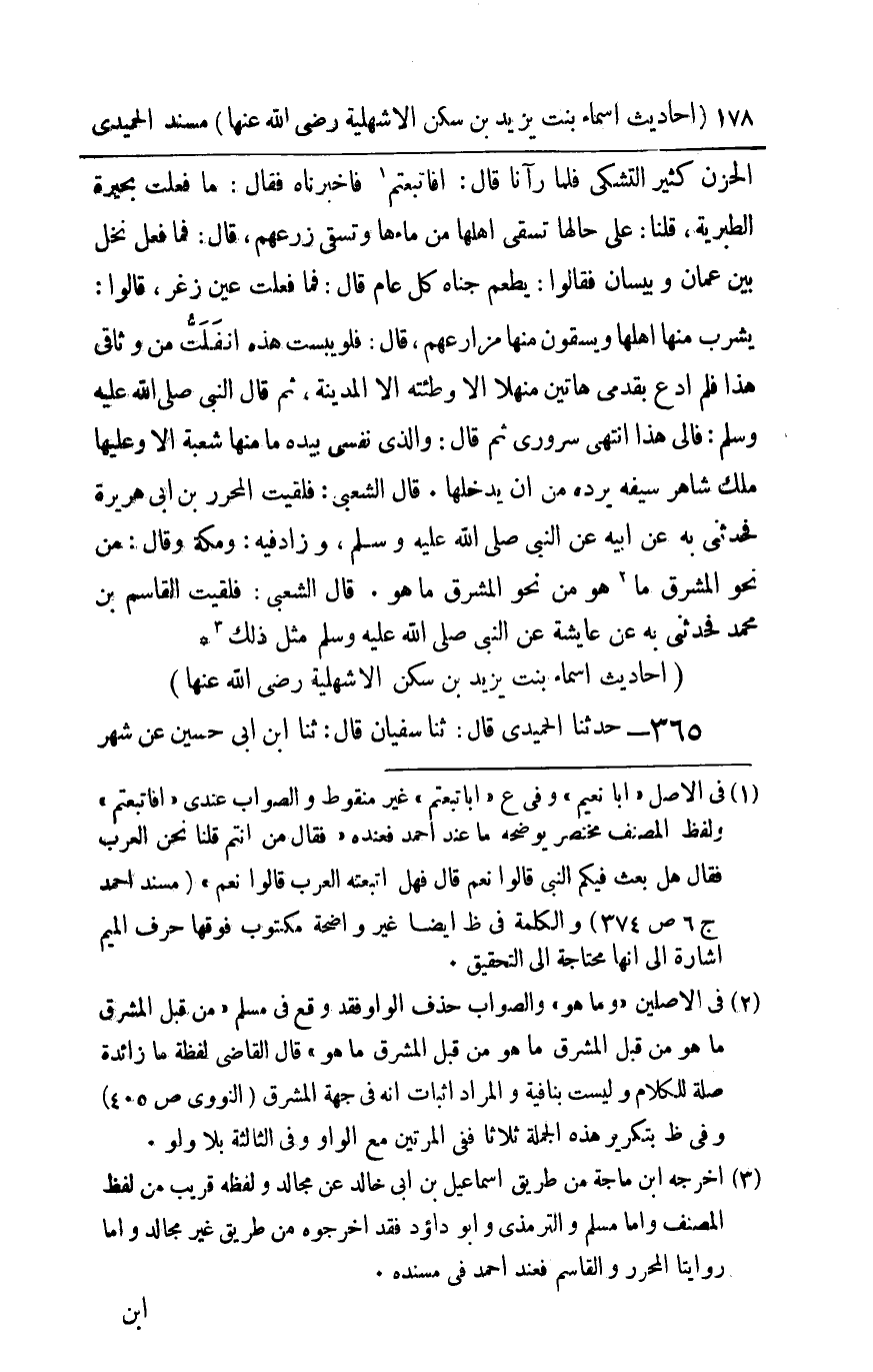 365 - حدثنا الحميدي قال ثنا سفيان قال ثنا بن أبي حسين عن شهر بن حوشب أنه سمع أسماء بنت يزيد بن سكن تقول حدثنا رسول الله صلى الله عليه و سلم عن الدجال فقرب أمره فقلت يا رسول الله إني لأعجن لأهلي العجين فما أظن أن يبلغ حتى يخرج فقال النبي صلى الله عليه و سلم : أن يخرج وأنا فيكم فأنا حجيجه دونكم وإن يخرج بعدي فالله خليفتي على كل مسلم