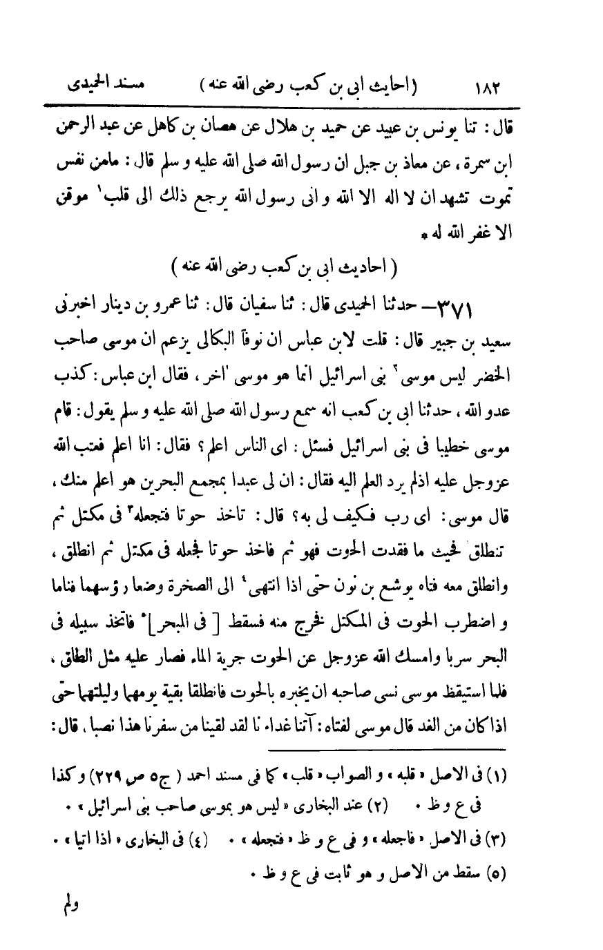 371 - حدثنا الحميدي قال ثنا سفيان قال ثنا عمرو بن دينار أخبرني سعيد بن جبير قال : قلت لابن عباس أن نوفا البكالي يزعم أن موسى صاحب الخضر ليس موسى بني إسرائيل إنما هو موسى آخر فقال بن عباس كذب عدو الله حدثنا أبي بن كعب أنه سمع رسول الله صلى الله عليه و سلم يقول قام موسى خطيبا في بني إسرائيل فسئل أي الناس أعلم فقال أنا أعلم فعتب الله عز و جل عليه إذ لم يرد العلم إليه فقال إن لي عبدا بمجمع البحرين هو أعلم منك قال موسى أي رب فكيف لي به قال تأخذ حوتا فتجعله في مكتل ثم تنطلق فحيث ما فقدت الحوت فهو ثم فأخذ حوتا فجعله في مكتل ثم انطلق وانطلق معه فتاه يوشع بن نون حتى إذا انتهى إلى الصخرة وضعا رؤوسهما فناما واضطرب الحوت في المكتل فخرج منه فسقط في البحر فاتخذ سبيله في البحر سربا وأمسك الله عز و جل عن الحوت جرية الماء فصار عليه مثل الطاق فلما استيقظ موسى نسي صاحبه أن يخبره بالحوت فانطلقا بقية يومهما وليلتهما حتى إذا كان من الغد قال موسى لفتاه آتنا غداءنا لقد لقينا من سفرنا هذا نصبا قال [ ص 183 ] ولم يجد موسى النصب حتى جاوز المكان الذي أمره الله عز و جل به فقال له فتاه أرأيت إذ أوينا إلى الصخرة فإني نسيت الحوت وما أنسانيه إلا الشيطان أن أذكره واتخذ سبيله في البحر عجبا قال وكان للحوت سربا ولموسى وفتاه عجبا فقال موسى عليه السلام ذلك ما كنا نبغ فارتدا على آثارهما قصصا قال رجعا يقصان آثارهما حتى إذا انتهيا إلى الصخرة فإذا رجل مسجا ثوبا فسلم عليه موسى فقال الخضر وإني بأرضك السلام قال أنا موسى قال موسى بني إسرائيل قال نعم أتيتك لتعلمني مما علمت رشدا قال الخضر إنك لن تستطيع معي صبرا يا موسى إني على علم من علم الله عز و جل علمنيه لا تعلمه وأنت على علم من علم الله عز و جل علمكه الله عز و جل لا أعلمه فقال له موسى ستجدني إن شاء الله صابرا ولا أعصي لك أمرا قال الخضر فإن اتبعتني فلا تسألني عن شيء حتى أحدث لك منه ذكرا فانطلقا يمشيان على ساحل البحر فمرت بهم سفينة فكلموهم أن يحملوهم فعرفوا الخضر فحملوهم بغير نول فلما ركبا السفينة لم يفجأ موسى إلا والخضر قد قلع لوحا من ألواح السفينة بالقدوم فقال موسى قوم حملونا بغير نول عمدت إلى سفينتهم فخرقتها لتغرق أهلها لقد جئت شيئا إمرا قال الخضر ألم أقل إنك لن تستطيع معي صبرا قال له موسى لا تؤاخذني بما نسيت ولا ترهقني من أمري عسرا قال وقال رسول الله صلى الله عليه و سلم وكانت الأولى من موسى نسيانا قال وجاء عصفور فوقع على حرف السفينة فنقر في البحر نقرة فقال له الخضر ما نقص علمي وعلمك من علم الله إلا مثل ما نقص العصفور من هذا البحر ثم خرجا من السفينة فبينما يمشيان على الساحل إذ أبصر الخضر غلاما يلعب في الغلمان فأخذ الخضر برأسه فاقتلعه بيده فقتله قال له موسى أقتلت نفسا زكية بغير نفس لقد جئت شيئا نكرا قال ألم أقل لك إنك لن تستطيع معي صبرا وهذه أشد من الأولى قال إن سألت عن شيء بعدها فلا تصاحبني قد بلغت من لدني عذرا قال فانطلقا حتى إذا أتيا أهل قرية استطعما أهلها فأبوا أن يضيفوهما فوجدا فيها جدارا يريد أن ينقض قال مائل فقال الخضر بيده هكذا فأقامه فقال موسى قوم أتيناهم ولم يطعمونا ولم يضيفونا لو شئت لاتخذت عليه أجرا قال هذا فراق بيني وبينك سأنبئك بتأويل ما لم تستطع عليه صبرا قال وقال رسول الله صلى الله عليه و سلم وددنا أن موسى صلى الله عليه و سلم كان صبر حتى يقص علينا من خبرهما قال سعيد بن جبير وكان بن عباس يقرأ وكان أمامهم ملك يأخذ كل سفينة صالحة غصبا وكان يقرأ وأما الغلام فكان كافرا وكان أبواه مؤمنين