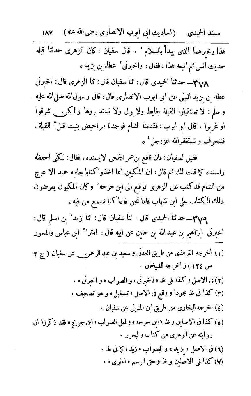 378 - حدثنا الحميدي قال ثنا سفيان قال ثنا الزهري قال أخبرني عطاء بن يزيد الليثي عن أبي أيوب الأنصاري قال قال رسول الله صلى الله عليه و سلم : لا تستقبلوا القبلة بغايط ولا بول ولا تستدبروها ولكن شرقوا أو غربوا قال أبو أيوب فقدمنا الشام فوجدنا مراحيض بنيت قبل القبلة فننحرف ونستغفر الله عز و جل فقيل لسفيان فإن نافع بن عمر الجمحي لا يسنده فقال لكني أحفظه وأسنده كما قلت لك ثم قال إن المكيين إنما أخذوا كتابا جاء به حميد إلا عرج من الشام قد كتب عن الزهري فوقع إلى بن حرحه وكان المكيون يعرضون ذلك الكتاب على بن شهاب فأما نحن فإنما كنا نسمع من فيه