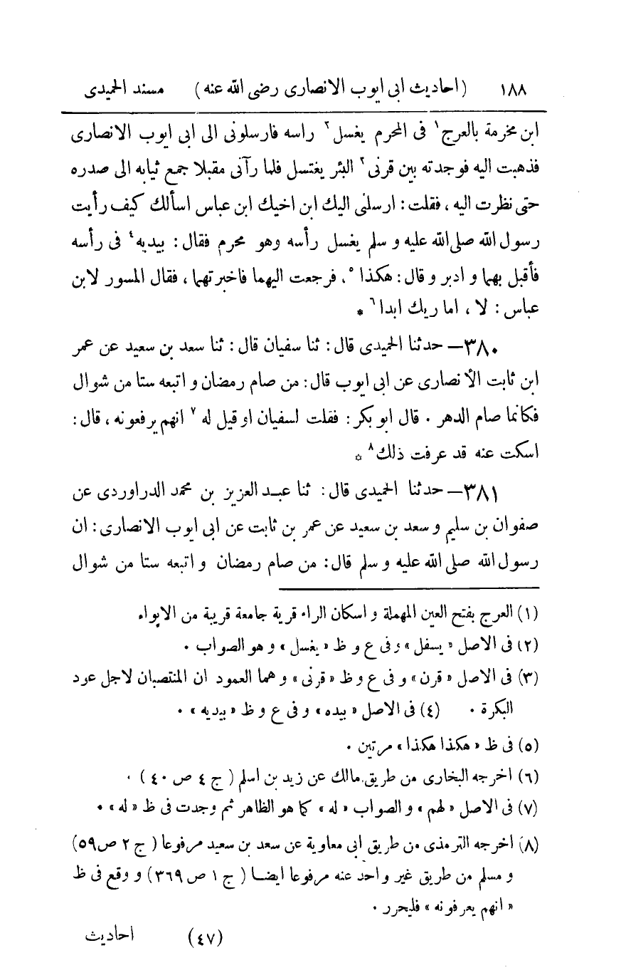 381 - حدثنا الحميدي قال ثنا عبد العزيز بن محمد الدراوردي عن صفوان بن سليم وسعد بن سعيد عن عمر بن ثابت عن أبي أيوب الأنصاري أن رسول الله صلى الله عليه و سلم قال : من صام رمضان وأتبعه ستا من شوال فكأنما صام الدهر