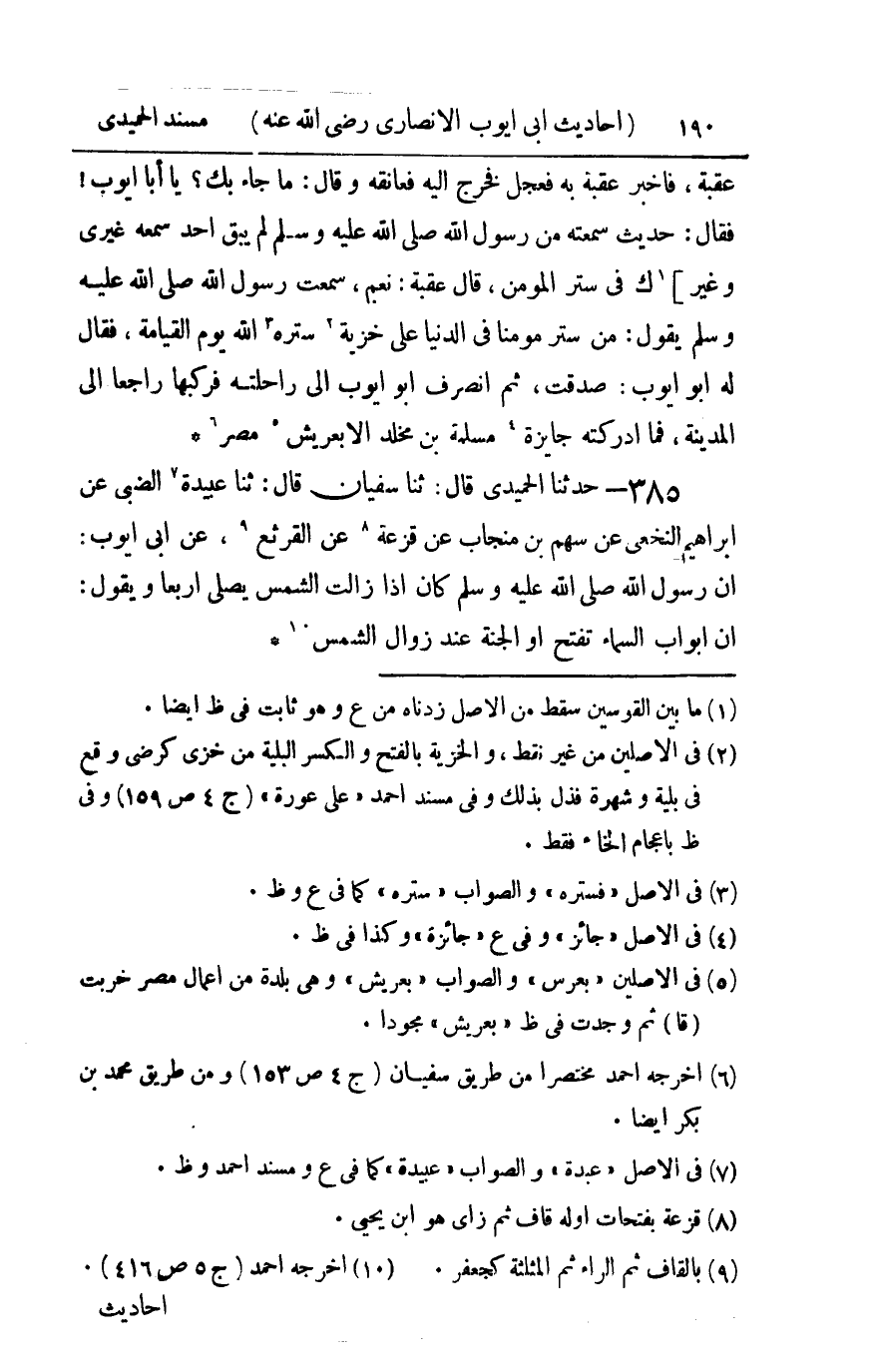 385 - حدثنا الحميدي قال ثنا سفيان قال ثنا عبيدة الضبي عن إبراهيم النخعي عن سهم بن منجاب عن قزعة عن القرثع عن أبي أيوب : أن رسول الله صلى الله عليه و سلم كان إذا زالت الشمس يصلي أربعا ويقول إن أبواب السماء تفتح أو الجنة عند زوال الشمس