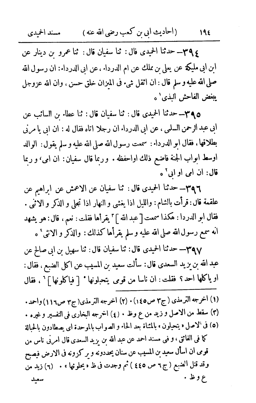 397 - حدثنا الحميدي قال ثنا سفيان قال ثنا سهيل بن أبي صالح عن عبد الله بن يزيد السعدي قال : سألت سعيد بن المسيب عن أكل الضبع فقال أو يأكلها أحد فقلت إن ناسا من قومي يتحبلونها فيأكلونها فقال سعيد أنه لا يصلح أكلها فقال شيخ عنده ألا أخبرك مما سمعت من أبي الدرداء سمعت أبا الدرداء يقول نهى رسول الله صلى الله عليه و سلم عن كل نهبة وعن كل خطفة خطفه وعن المجثمة وعن كل ذي ناب من السبع فقال سعيد صدقت