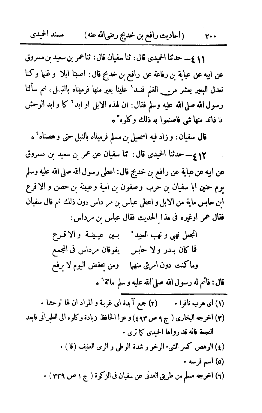 412 - حدثنا الحميدي قال ثنا سفيان عن عمر بن سعيد بن مسروق عن أبيه عن عباية عن رافع بن خديج قال : أعطى رسول الله صلى الله عليه و سلم يوم حنين أبا سفيان بن حرب وصفوان بن أمية وعيينة بن حصن والأقرع بن حابس مائة من الإبل وأعطى عباس بن مرداس دون ذلك ثم قال سفيان فقال عمر أو غيره في هذا الحديث فقال عباس بن مرداس ... أتجعل نهبي ونهب العبيد ... بين عيينة والأقرع ... ... فما كان بدر ولا حابس ... يفوقان مرداس في المجمع ... ... وما كنت دون امرئ منهما ... ومن يخفض اليوم لا يرفع ... قال فأتم له رسول الله صلى الله عليه و سلم مائة