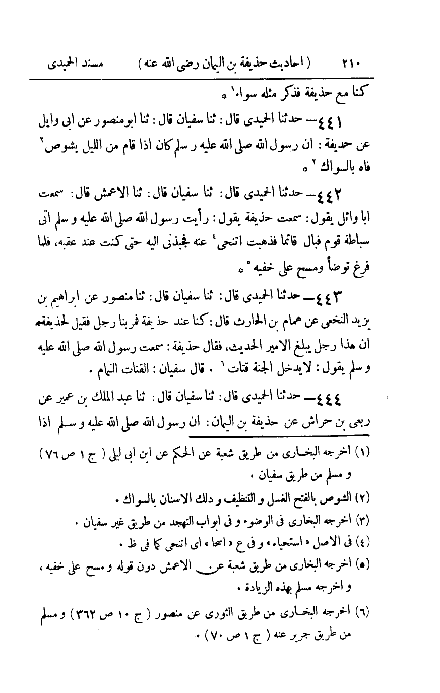 441 - حدثنا الحميدي قال ثنا سفيان قال ثنا أبو منصور عن أبي وايل عن حذيفة : أن رسول الله صلى الله عليه و سلم كان إذا قام من الليل يشوص فاه بالسواك