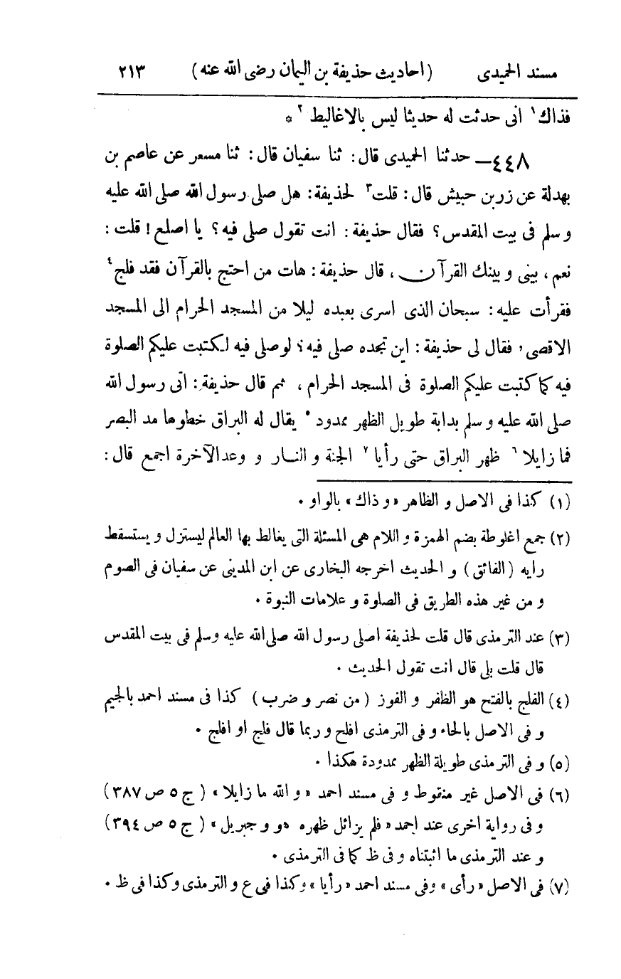 448 - حدثنا الحميدي قال ثنا سفيان قال ثنا مسعر عن عاصم بن بهدلة عن زر بن حبيش قال : قلت لحذيفة هل صلى رسول الله صلى الله عليه و سلم في بيت المقدس فقال حذيفة أنت تقول صلى فيه يا أصلع قلت نعم بيني وبينك القرآن قال حذيفة هات من احتج بالقرآن فقد فلج فقرأت عليه سبحان الذي أسرى بعبده ليلا من المسجد الحرام إلى المسجد الأقصى فقال لي حذيفة أين تجده صلى فيه لو صلى فيه لكتبت عليكم الصلاة فيه كما كتبت عليكم الصلاة في المسجد الحرام ثم قال حذيفة أتى رسول الله صلى الله عليه و سلم بداية طويل الظهر ممدود يقول له البراق خطوها مد البصر فما زايلا ظهر البراق حتى رأيا الجنة والنار ووعد الآخرة اجمع قال ويحدثون أنه ربطه لم أيفر لم أيفر منه وإنما سخره له عالم الغيب والشهادة