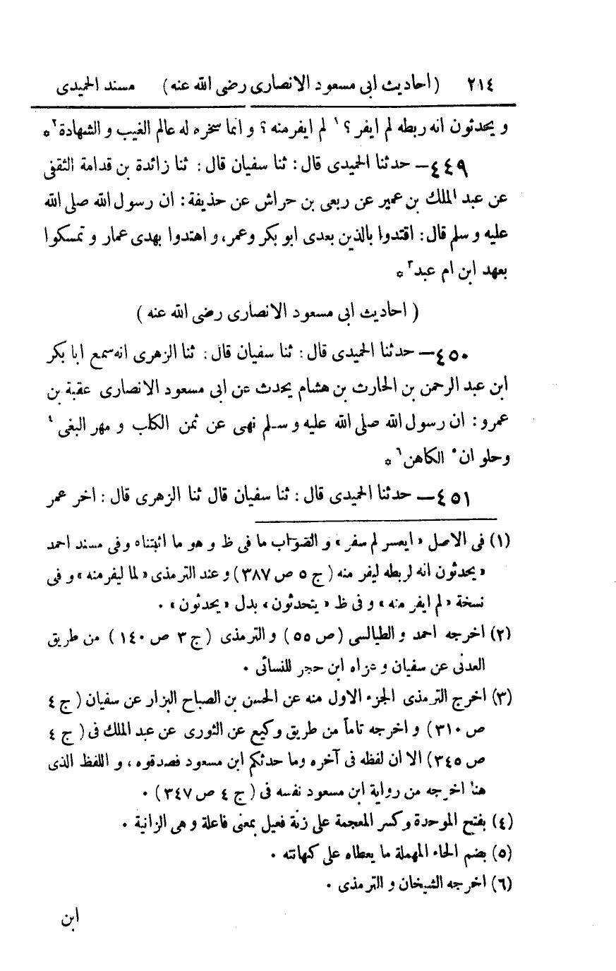 450 - حدثنا الحميدي قال ثنا سفيان قال ثنا الزهري أنه سمع أبا بكر بن عبد الرحمن بن الحارث بن هشام يحدث عن أبي مسعود الأنصاري عقبة بن عمرو : أن رسول الله صلى الله عليه و سلم نهى عن ثمن الكلب ومهر البغي وحلوان الكاهن