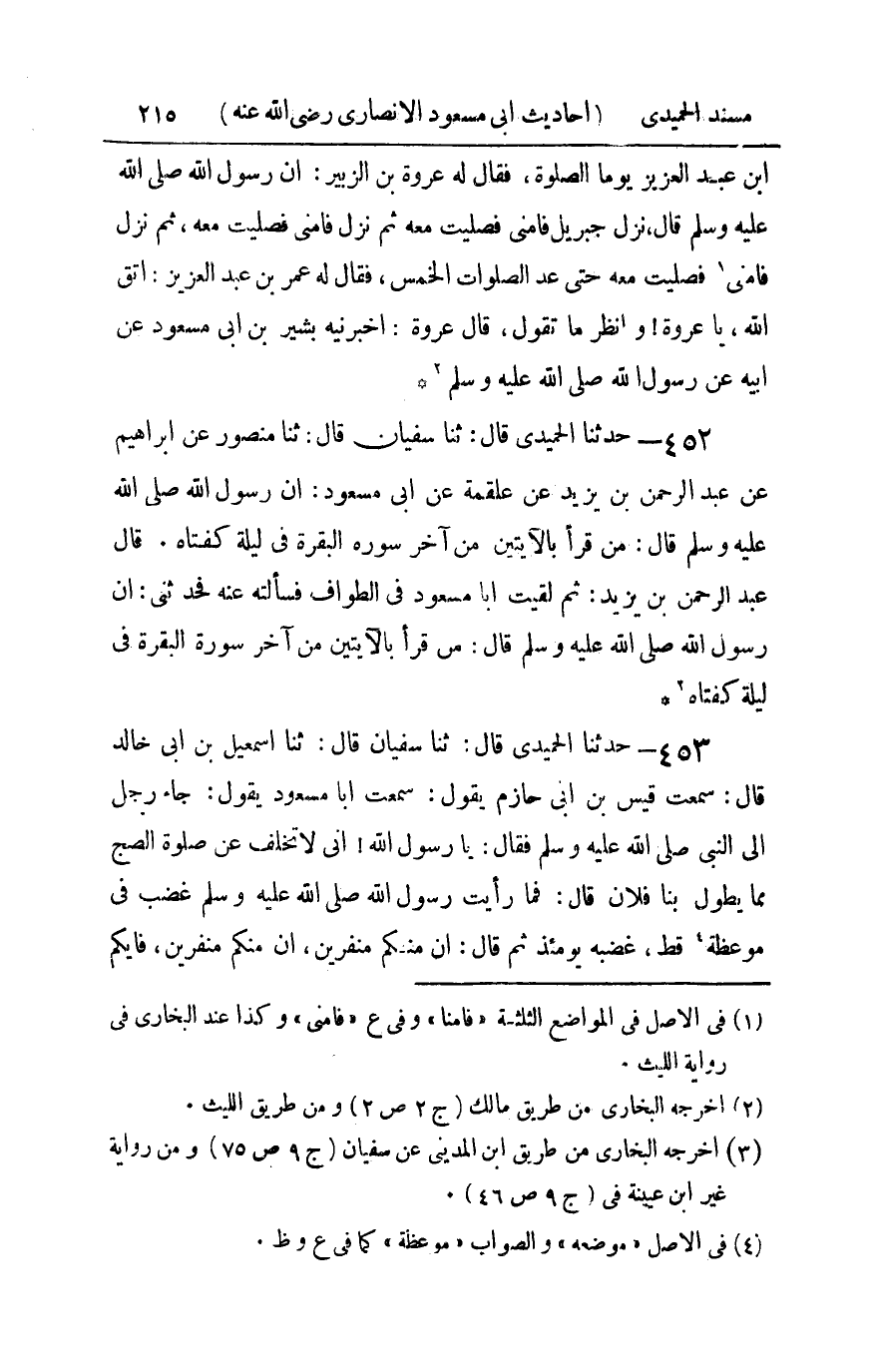 453 - حدثنا الحميدي قال ثنا سفيان قال ثنا إسماعيل بن أبي خالد قال سمعت قيس بن أبي حازم يقول سمعت أبا مسعود يقول جاء رجل إلى النبي صلى الله عليه و سلم فقال : يا رسول الله إني لأتخلف عن صلاة الصبح مما يطول بنا فلان قال فما رأيت رسول الله صلى الله عليه و سلم غضب في موعظة قط غضبه يومئذ ثم قال إن منكم منفرين إن منكم منفرين فأيكم أم الناس فليخفف فإن فيهم الكبير والسقيم والضعيف وذا الحاجة
