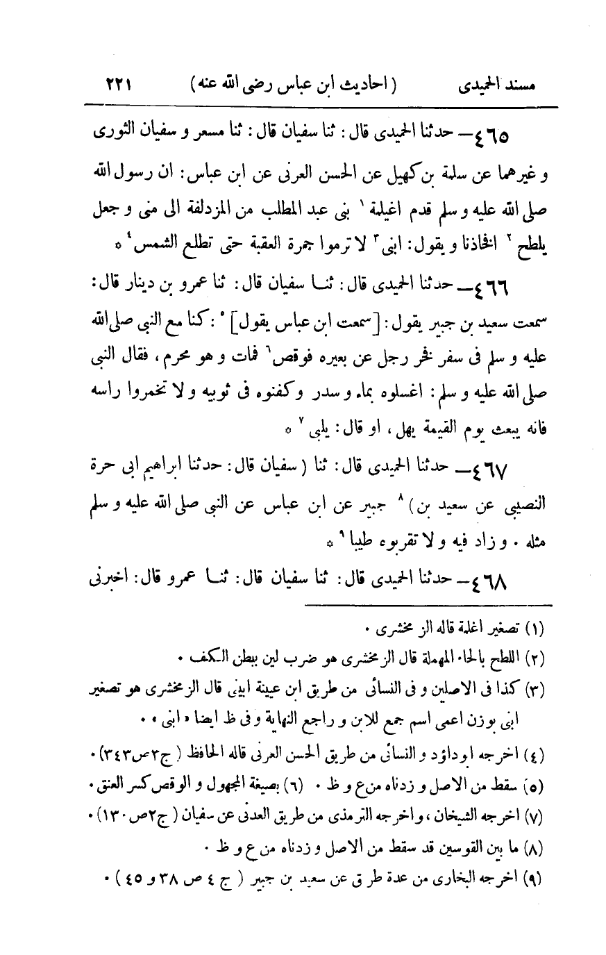 465 - حدثنا الحميدي قال ثنا سفيان قال ثنا مسعر وسفيان الثوري وغيرهما عن سلمة بن كهيل عن الحسن العرني عن بن عباس : أن رسول الله صلى الله عليه و سلم قدم أغيلمة بني عبد المطلب من المزدلفة إلى منى وجعل يلطح أفخاذنا ويقول ابني لا ترموا جمرة العقبة حتى تطلع الشمس