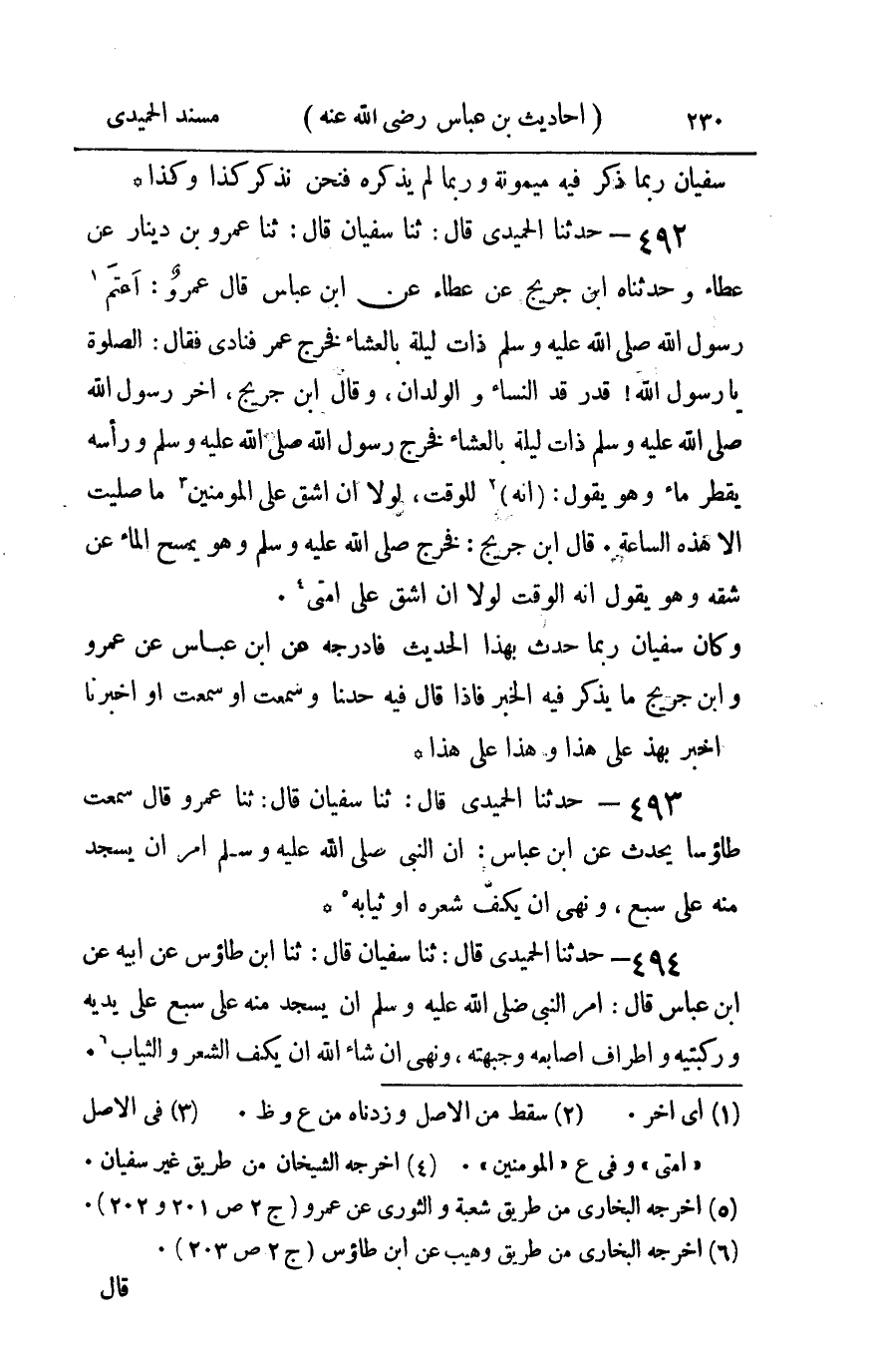 493 - حدثنا الحميدي قال ثنا سفيان قال ثنا عمرو قال سمعت طاوسا يحدث عن بن عباس : أن النبي صلى الله عليه و سلم أمر أن يسجد منه على سبع ونهى أن يكف شعره أو ثيابه