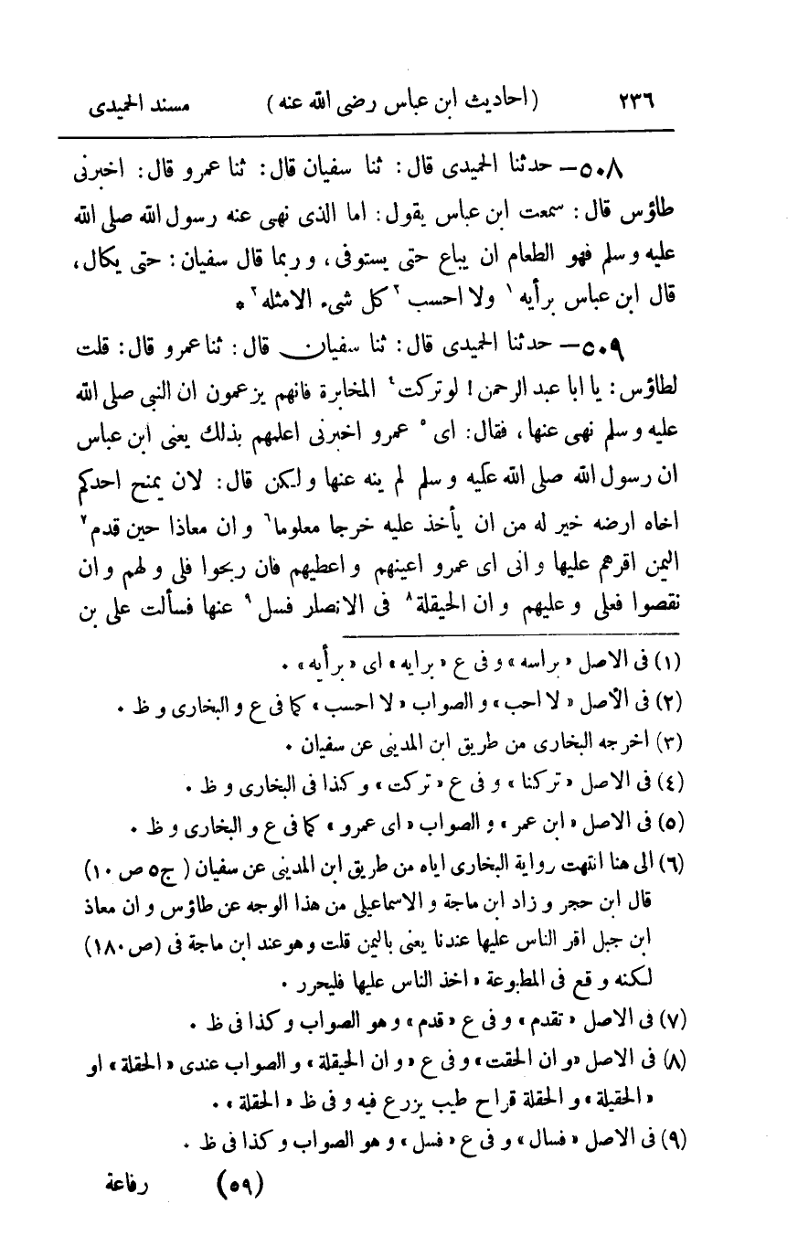 509 - حدثنا الحميدي قال ثنا سفيان قال ثنا عمرو : قال قلت لطاؤس يا أبا عبد الرحمن لو تركت المخابرة فإنهم يزعمون أن النبي صلى الله عليه و سلم نهى عنها فقال أي عمرو أخبرني أعلمهم بذلك يعني بن عباس أن رسول الله صلى الله عليه و سلم لم ينه عنها ولكن قال لأن يمنح أحدكم أخاه أرضه خير له من أن يأخذ عليه خرجا معلوما وإن معاذا حين قدم اليمن أقرهم عليها وإني أي عمرو أعينهم وأعطيهم فإن ربحوا فلي ولهم وإن نقصوا فعلي وعليهم وإن الحيقلة في الأنصار فسل عنها فسألت علي بن رفاعة فقال هي المخابرة