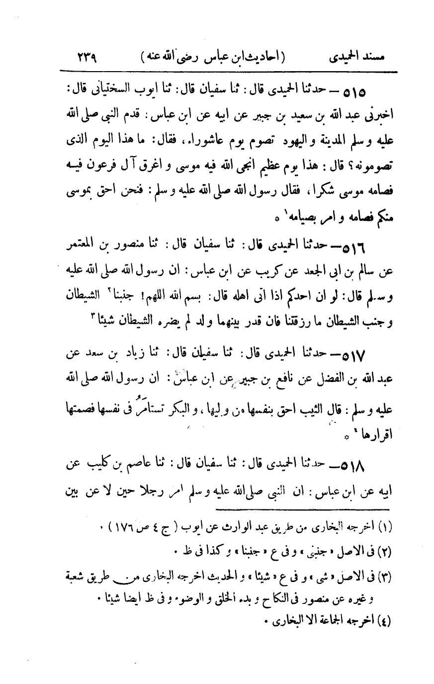 515 - حدثنا الحميدي قال ثنا سفيان قال ثنا أيوب السختياني قال أخبرني عبد الله بن سعيد بن جبير عن أبيه عن بن عباس : قدم النبي صلى الله عليه و سلم المدينة واليهود تصوم يوم عاشوراء فقال ما هذا اليوم الذي تصومونه قال هذا يوم عظيم أنجى الله فيه موسى وأغرق آل فرعون فيه فصامه موسى شكرا فقال رسول الله صلى الله عليه و سلم فنحن أحق بموسى منكم فصامه وأمر بصيامه