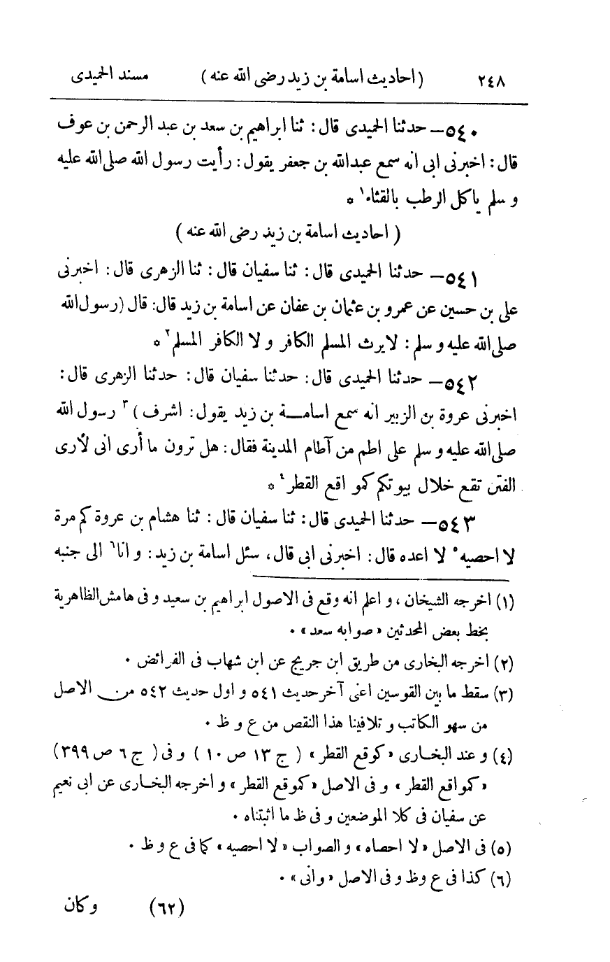 541 - حدثنا الحميدي قال ثنا سفيان قال ثنا الزهري قال أخبرني علي بن حسين عن عمرو بن عثمان بن عفان عن أسامة بن زيد قال قال رسول الله صلى الله عليه و سلم : لا يرث المسلم الكافر ولا الكافر المسلم