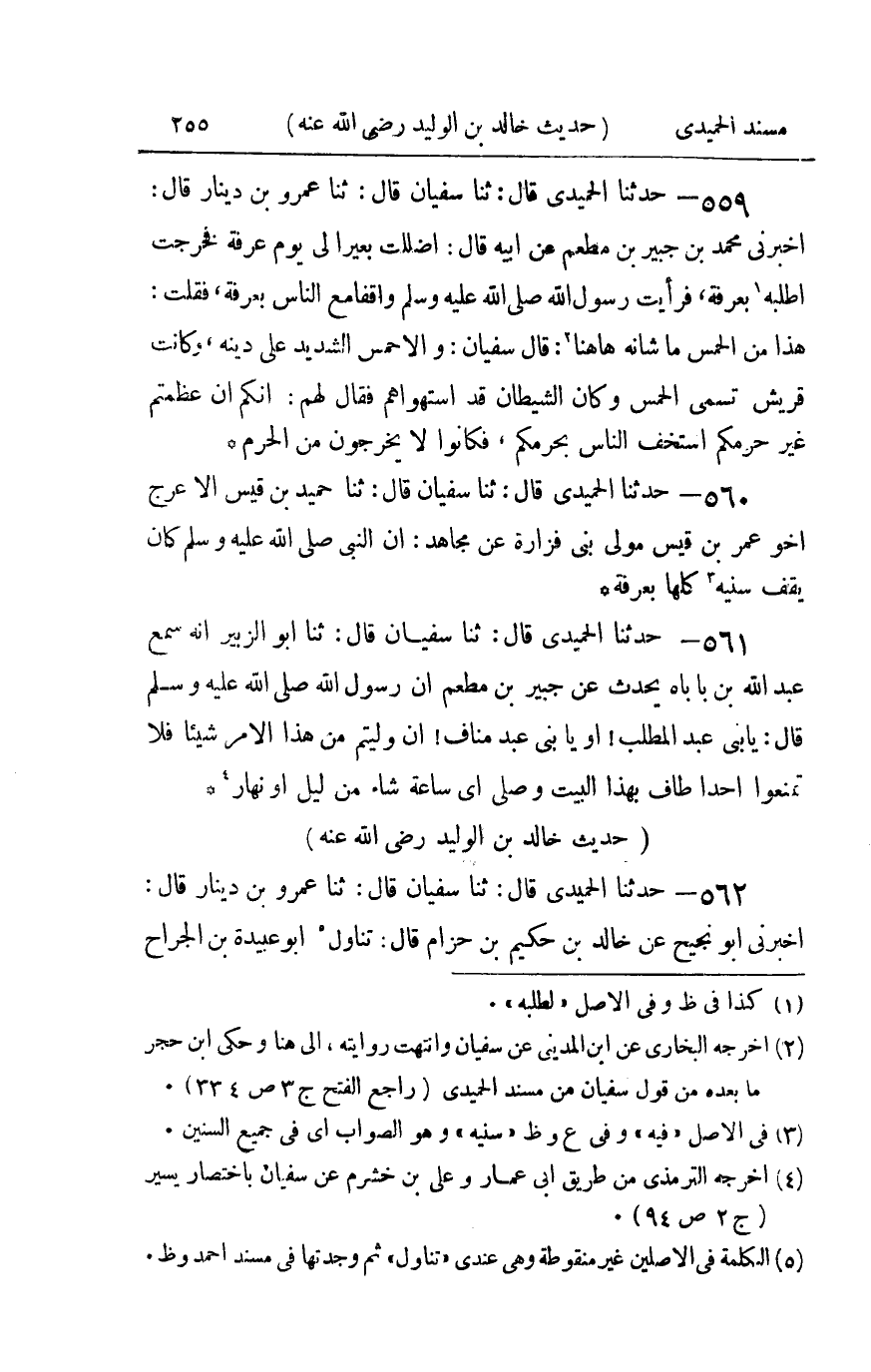 559 - حدثنا الحميدي قال ثنا سفيان قال ثنا عمرو بن دينار قال أخبرني محمد بن جبير بن مطعم عن أبيه قال : أضللت بعيرا لي يوم عرفة فخرجت أطلبه بعرفة فرأيت رسول الله صلى الله عليه و سلم واقفا مع الناس بعرفة فقلت هذا من الحمس ما شأنه هاهنا قال سفيان والأحمس الشديد على دينه وكانت قريش تسمى الحمس وكان الشيطان قد استهواهم فقال لهم إنكم إن عظمتم غير حرمكم استخف الناس بحرمكم فكانوا لا يخرجون من الحرم