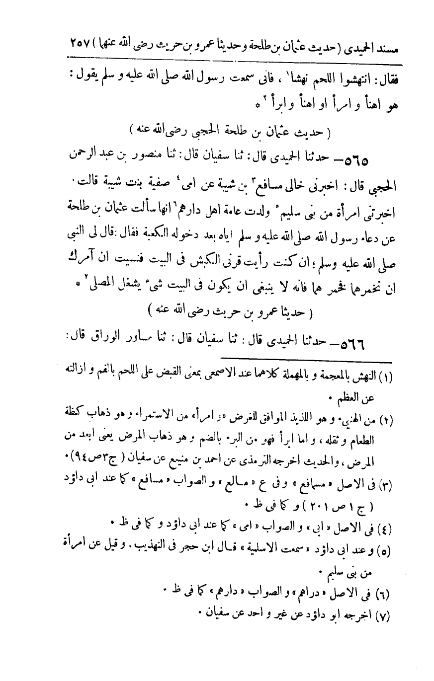 565 - حدثنا الحميدي قال ثنا سفيان قال ثنا منصور بن عبد الرحمن الحجبي قال أخبرني خالي مسافع بن شيبة عن أمي صفية بنت شيبة قالت : أخبرتني امرأة من بني سليم ولدت عامة أهل دارهم أنها سألت عثمان بن طلحة عن دعاء رسول الله صلى الله عليه و سلم إياه بعد دخوله الكعبة فقال قال لي النبي صلى الله عليه و سلم إن كنت رأيت قرني الكبش في البيت فنسيت أن آمرك أن تخمرهما فخمرهما فإنه لا ينبغي أن يكون في البيت شيء يشغل المصلى